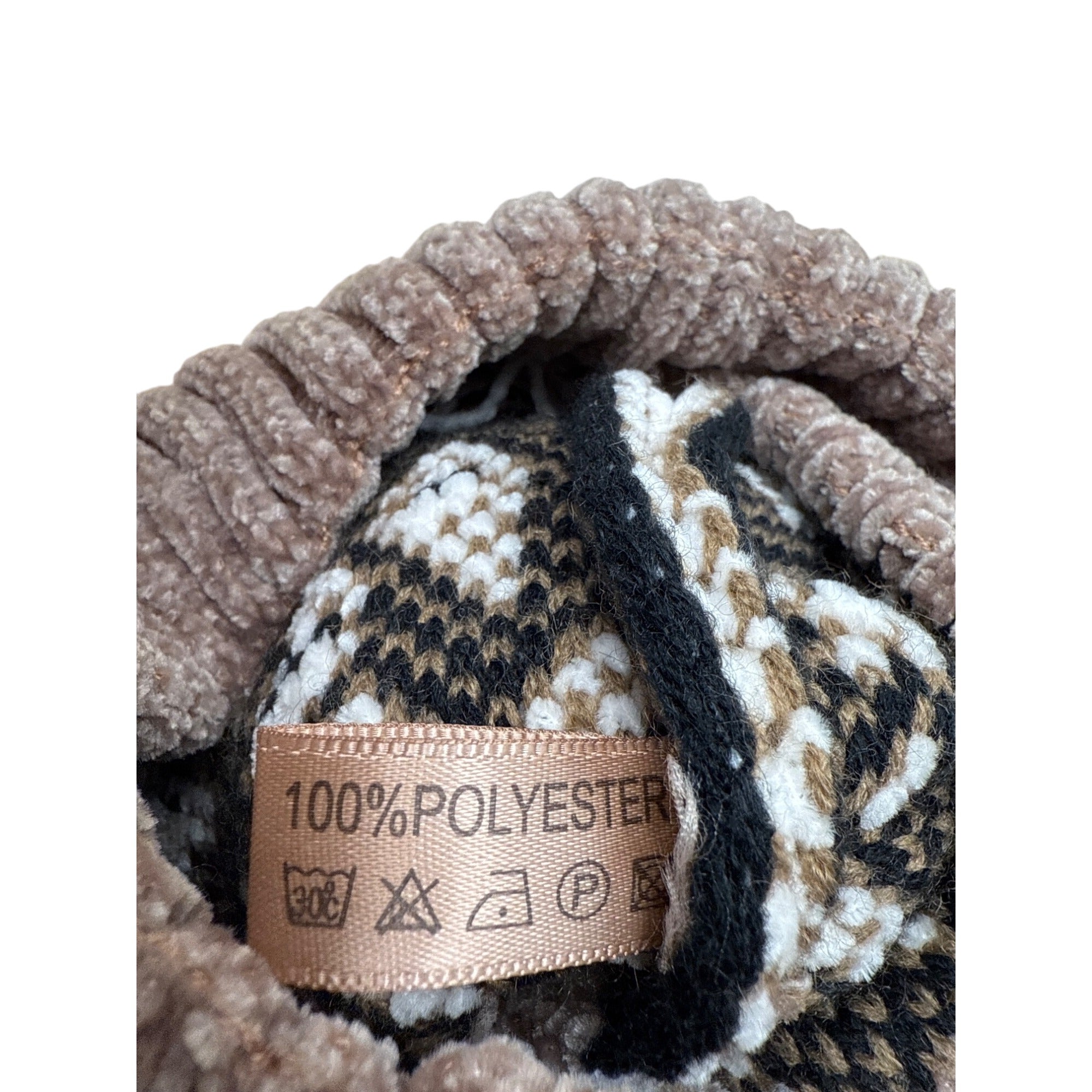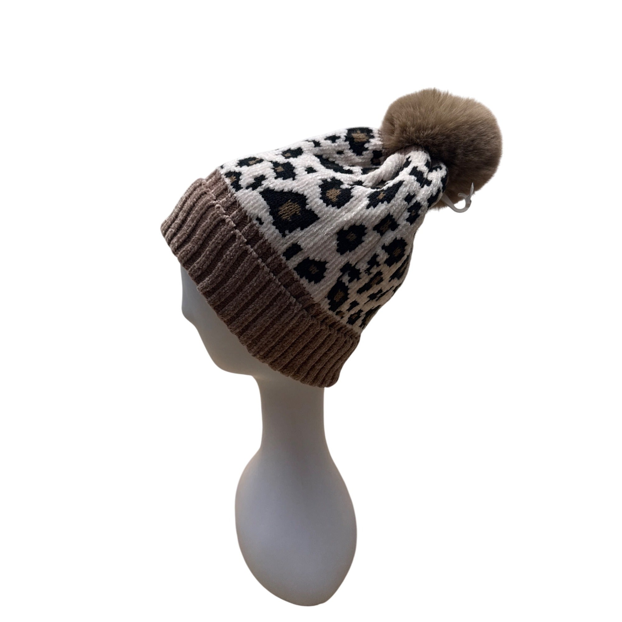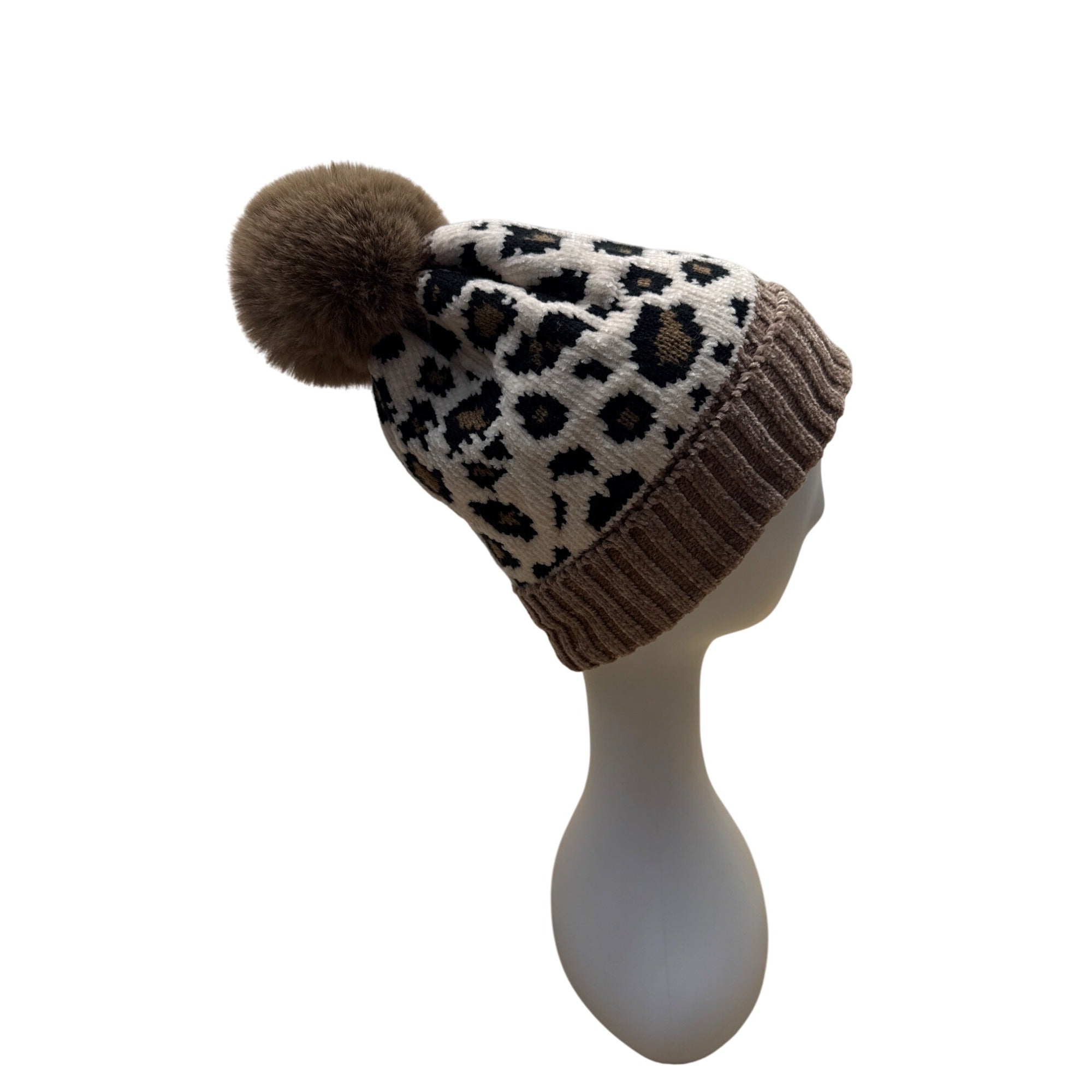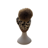Leopard Print Knit Beanie With Faux Fur Pom Brown Ribbed