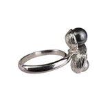 This elegant Sarah Coventry statement ring is crafted in a timeless silver tone, showcasing the brand’s dedication to classic jewelry design. Adorned with two simulated pearls in contrasting hues—one lustrous white and the other a deep gray—it forms a striking balance of light and dark. The textured and sculptural details surrounding the pearls add an element of artistry, evoking a retro feel from the mid-20th century. An essential addition to any collection of vintage-style accessories, the piece embodies understated elegance with a dash of bold charm. Stamped with the Sarah Coventry logo, this item reflects the brand’s rich history of crafting accessible yet stylish jewelry. Sized at approximately 5, the ring's robust and intricate design makes it equally suitable as a collector's piece or a statement accessory for special occasions.
