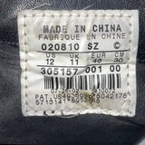Stylish leather mid-top boots with ankle strap detail. Scuffs, wear, and stitching tears visible on sides. Made in China, US size 12. Durable and lightweight.