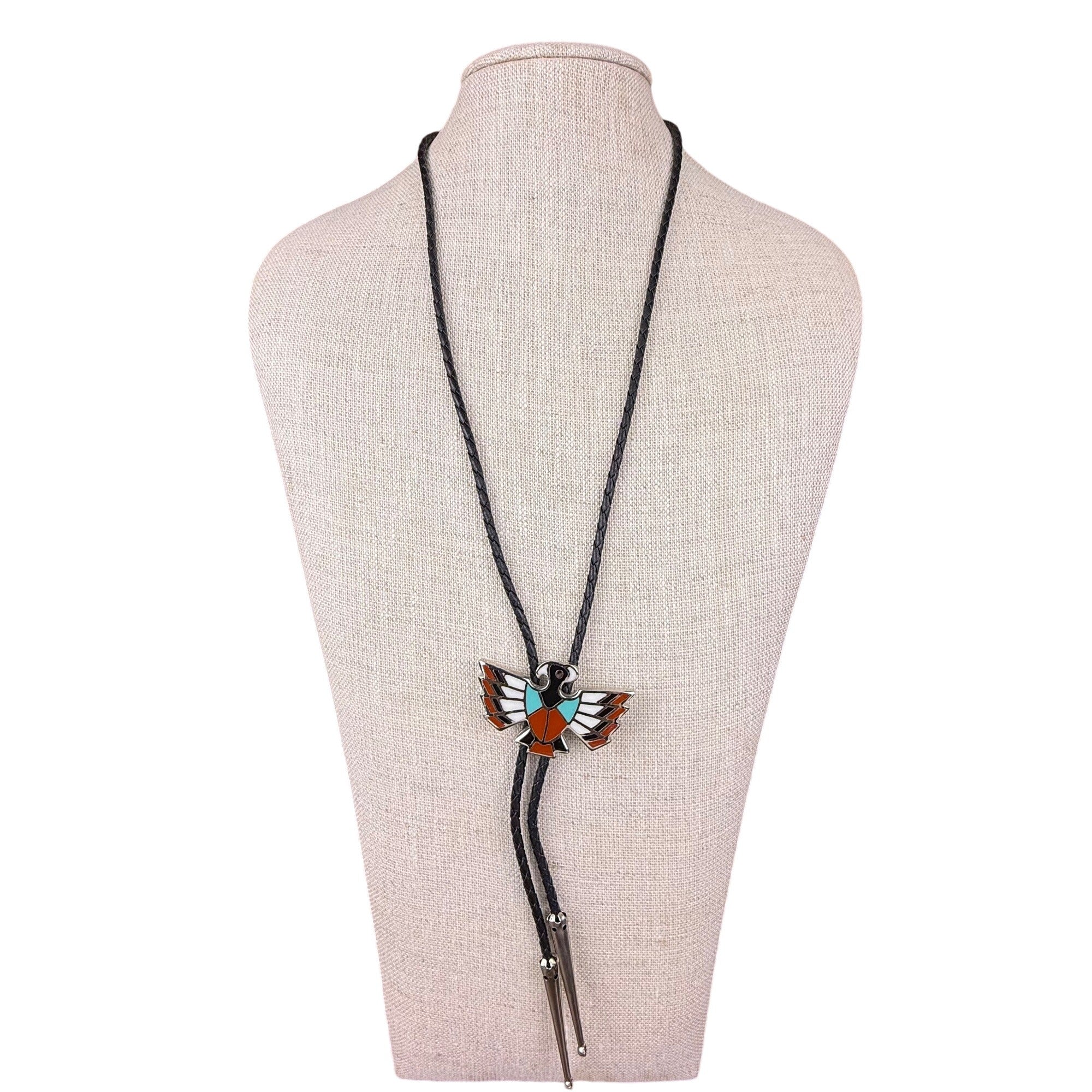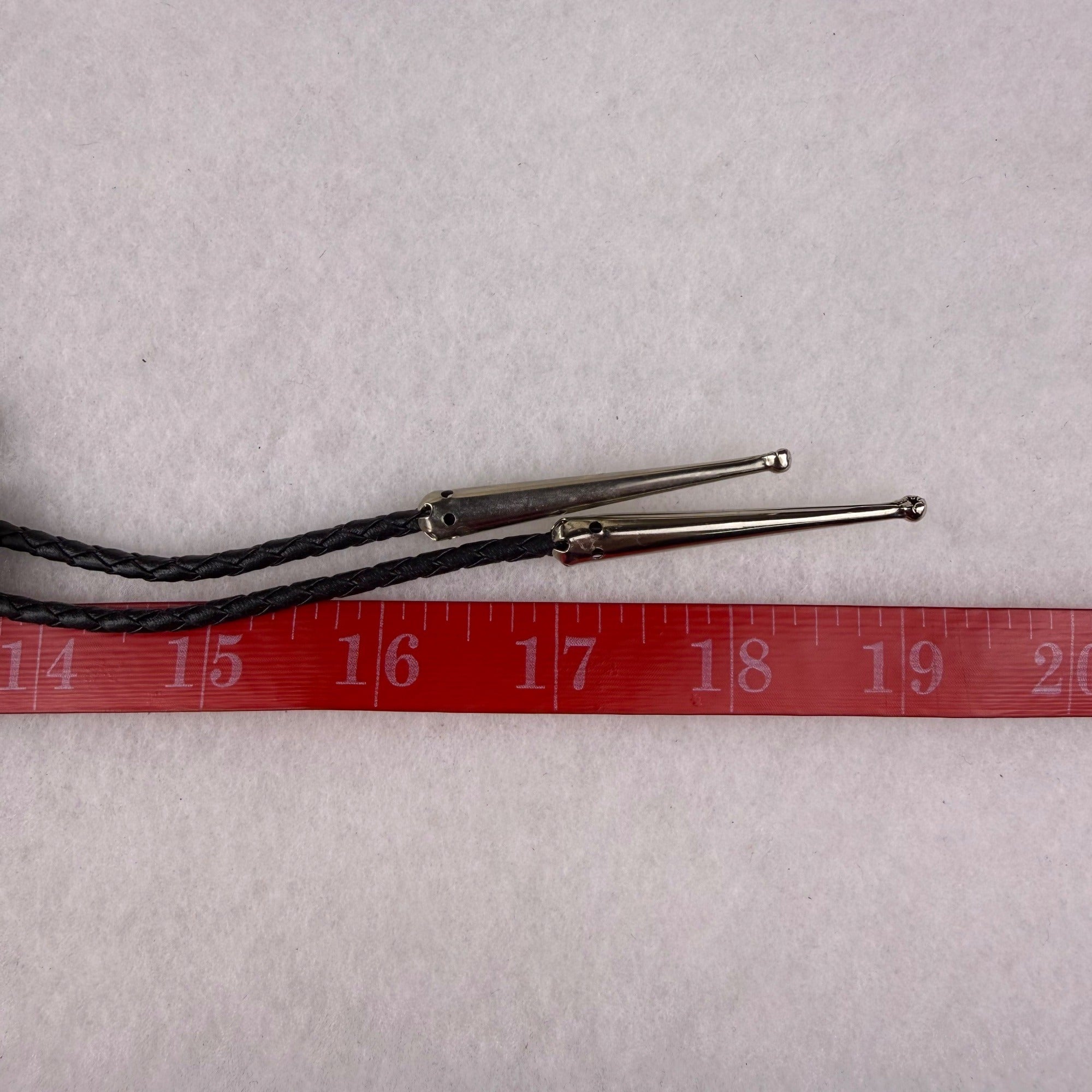 Black Silver Tone Thunderbird Inlay Western Bolo Tie Braided Leather Cord