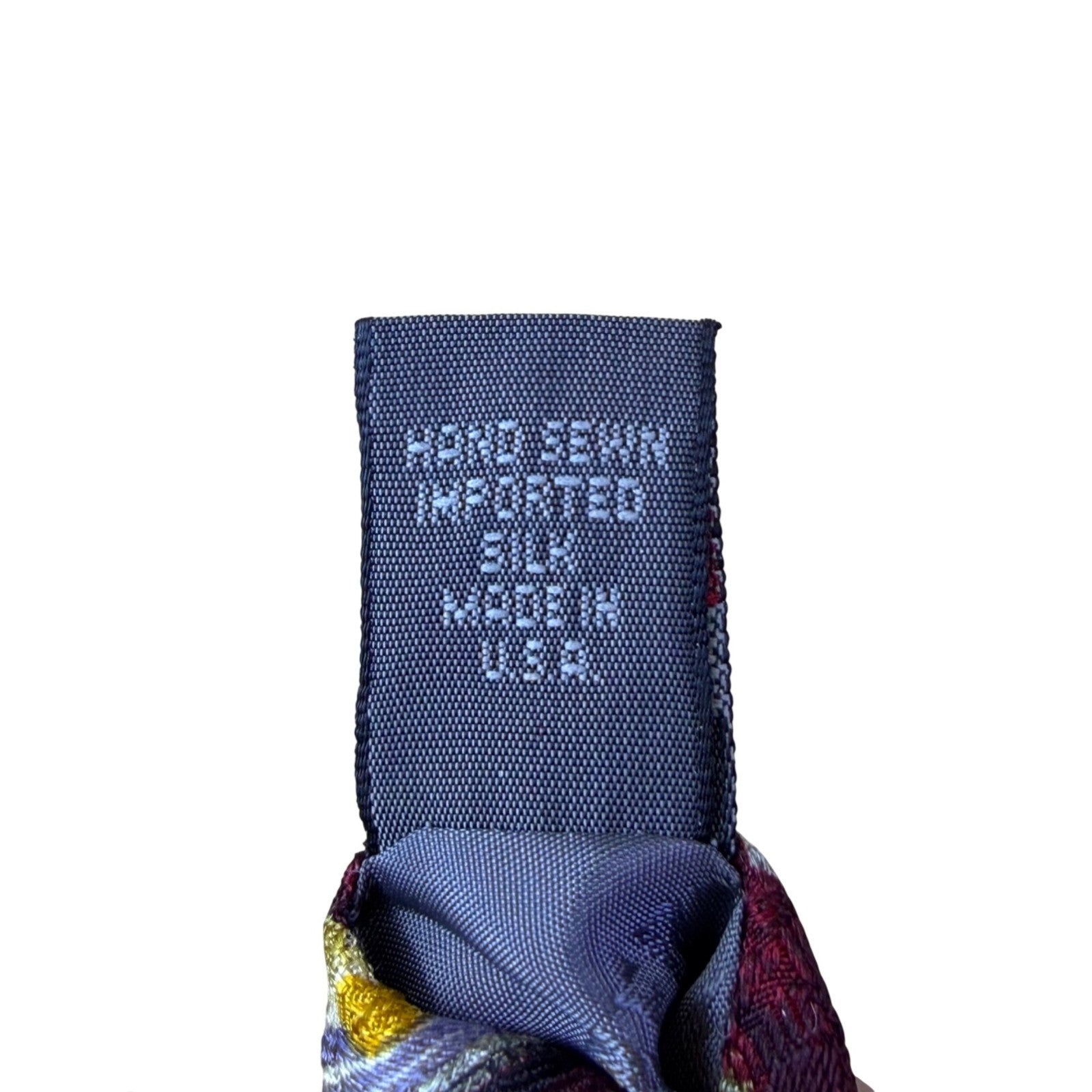 This Robert Talbott men's tie features a burgundy floral and geometric pattern with accents of green, yellow, and blue. Crafted from imported silk, it is hand-sewn and made in the USA.