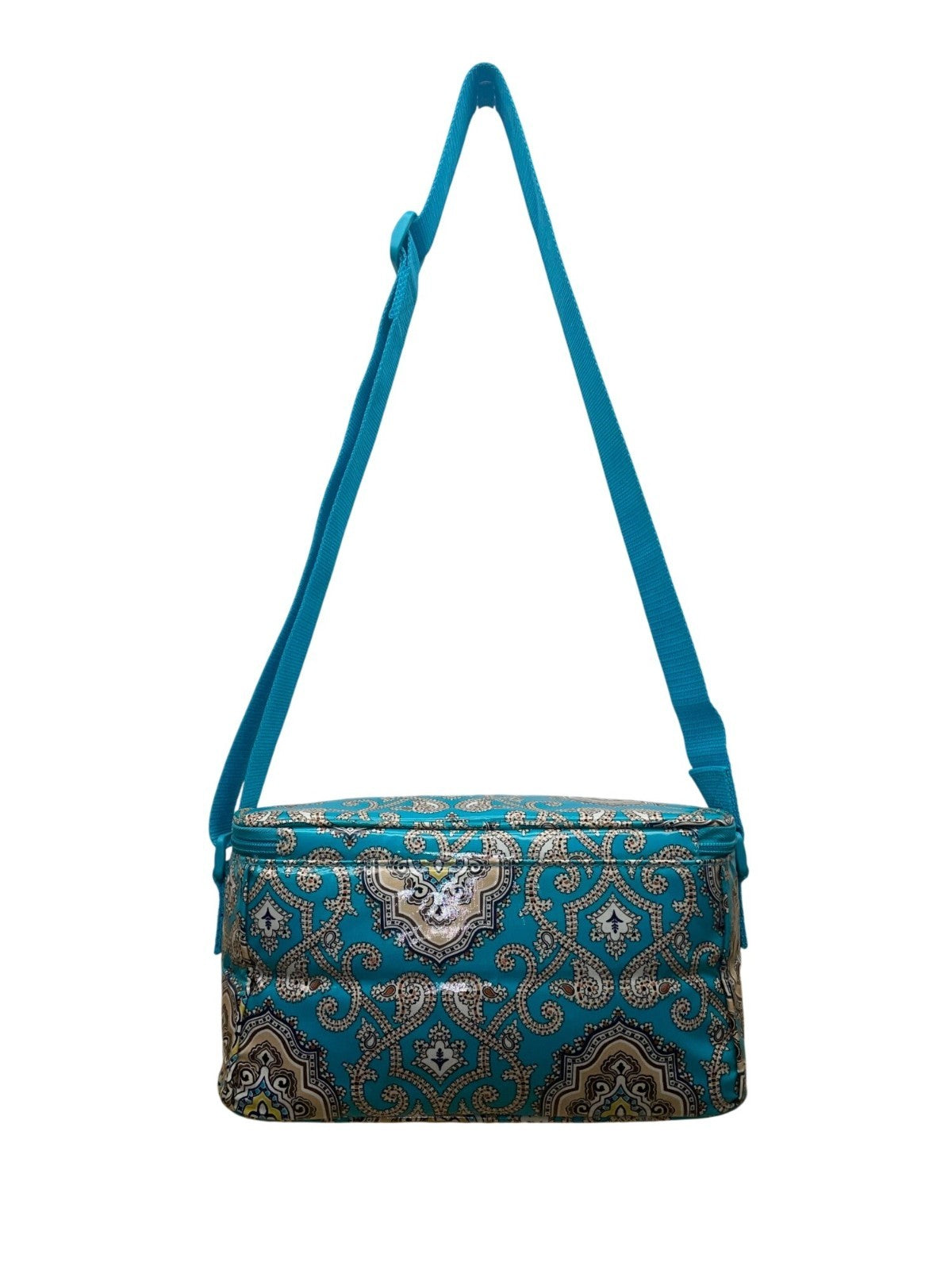 Lunch bag with an eye-catching paisley pattern, vinyl-coated finish, spacious interior, zip closure, adjustable strap, and front pocket for versatile use.