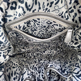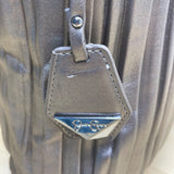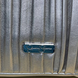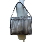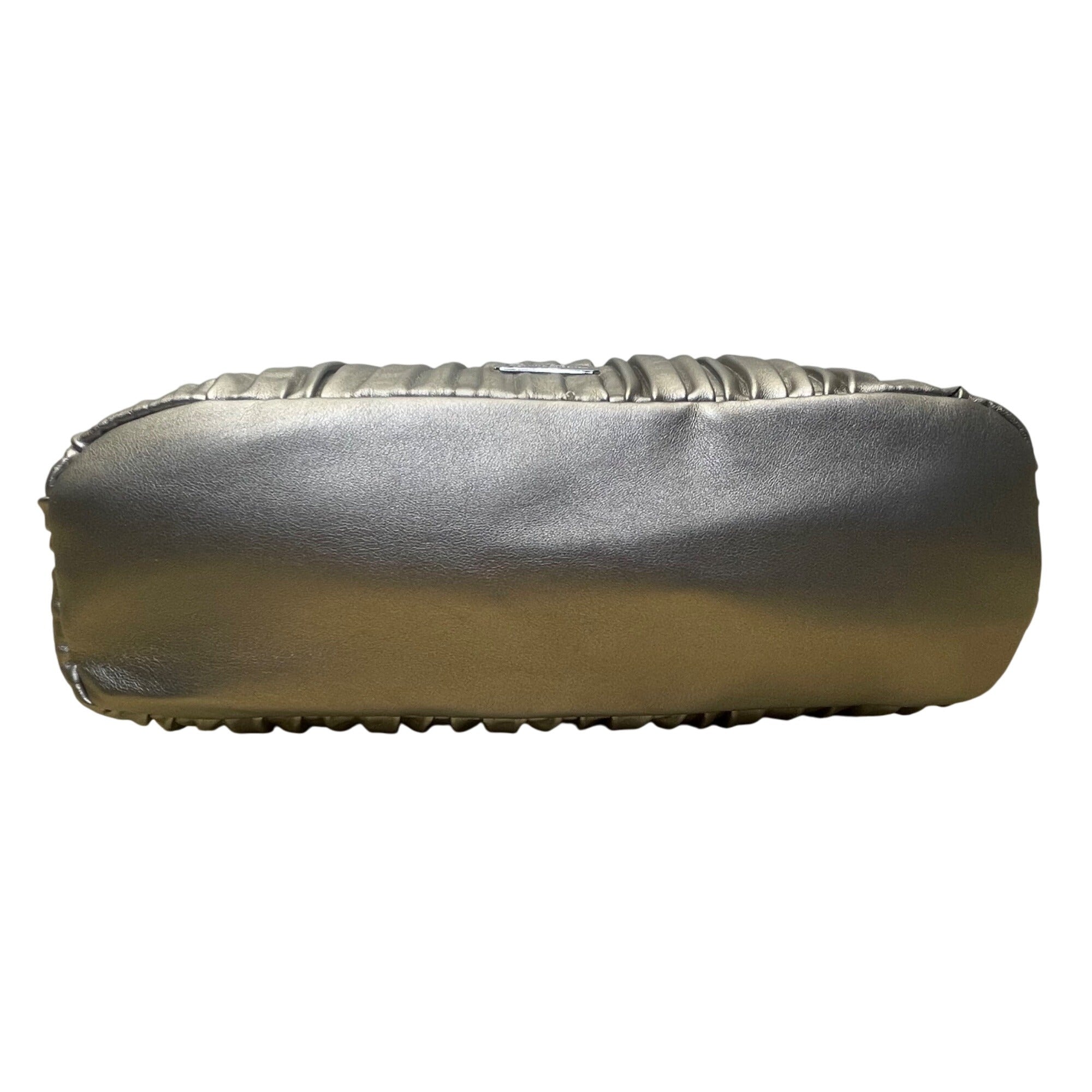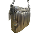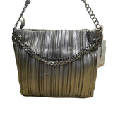 Elegant pleated platinum metallic finish, chain and leather strap detail, spacious interior, secured zip-top closure, original tag MSRP $128, versatile design for casual or dressy ensembles.