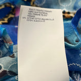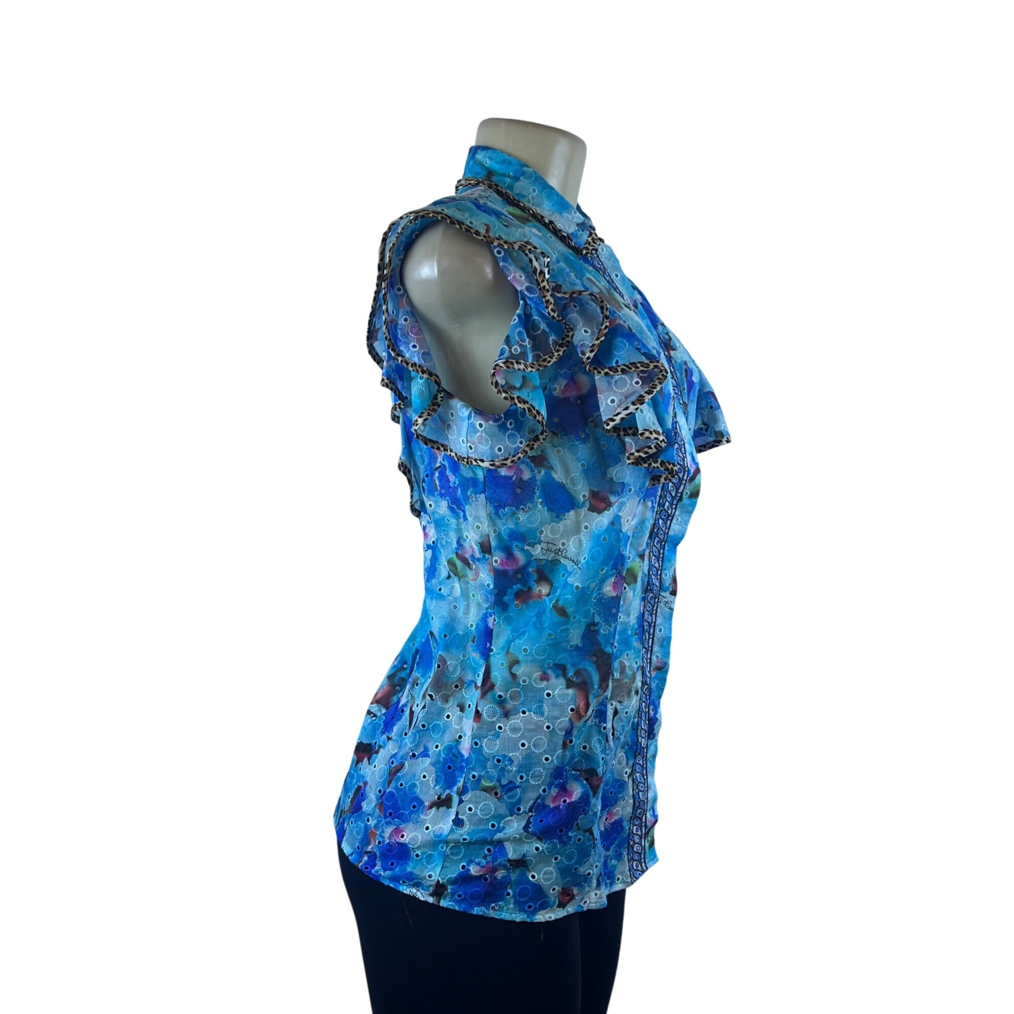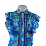 Justcavalli Womens Blue Cotton Printed Blouse Ruffled Sleeves & Leopard Trim 42