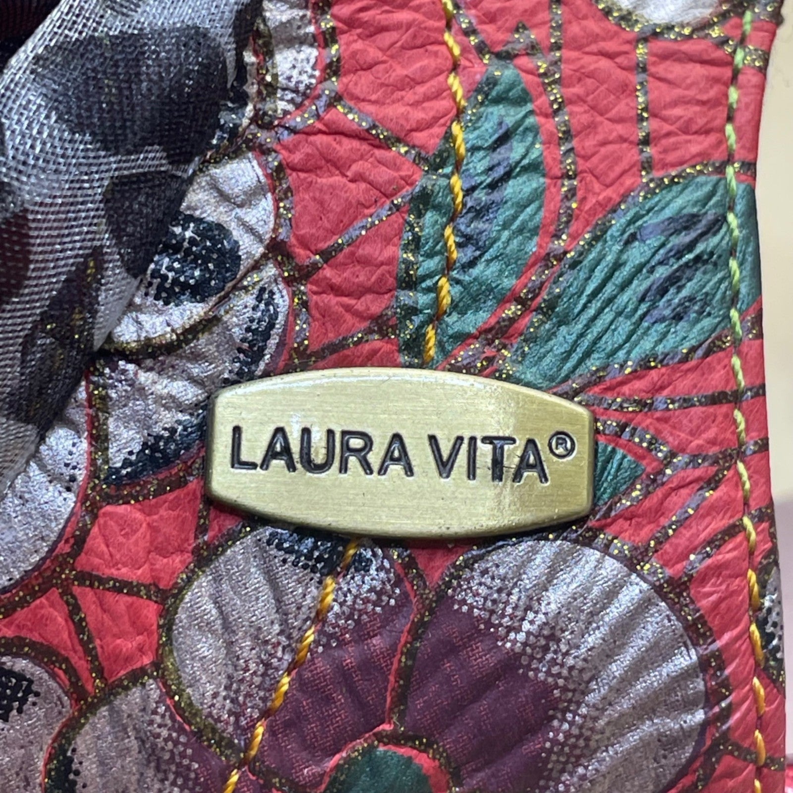 Laura Vita Women’s Red Floral Pattern Leather Open Toe Bow Accent Heels Size 10