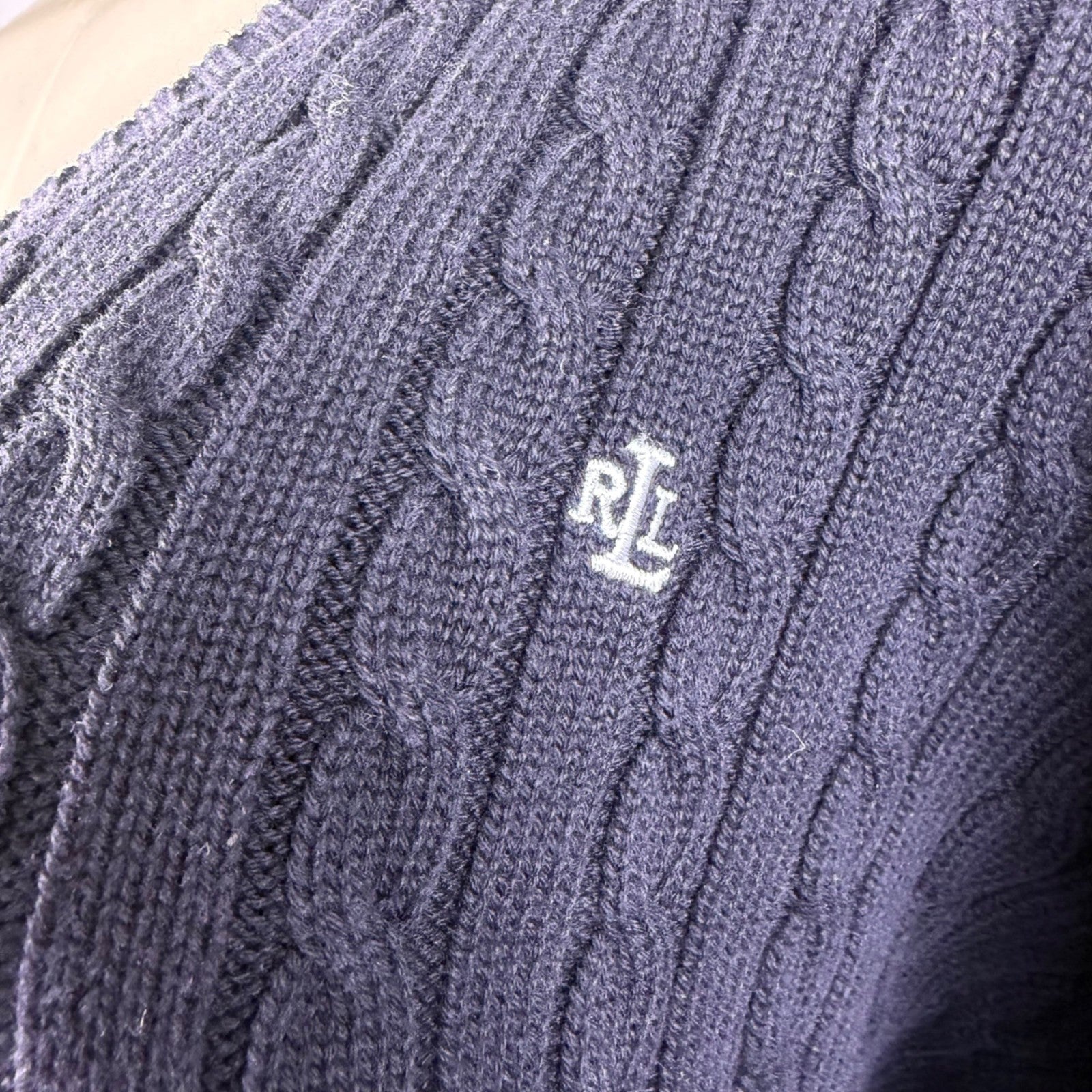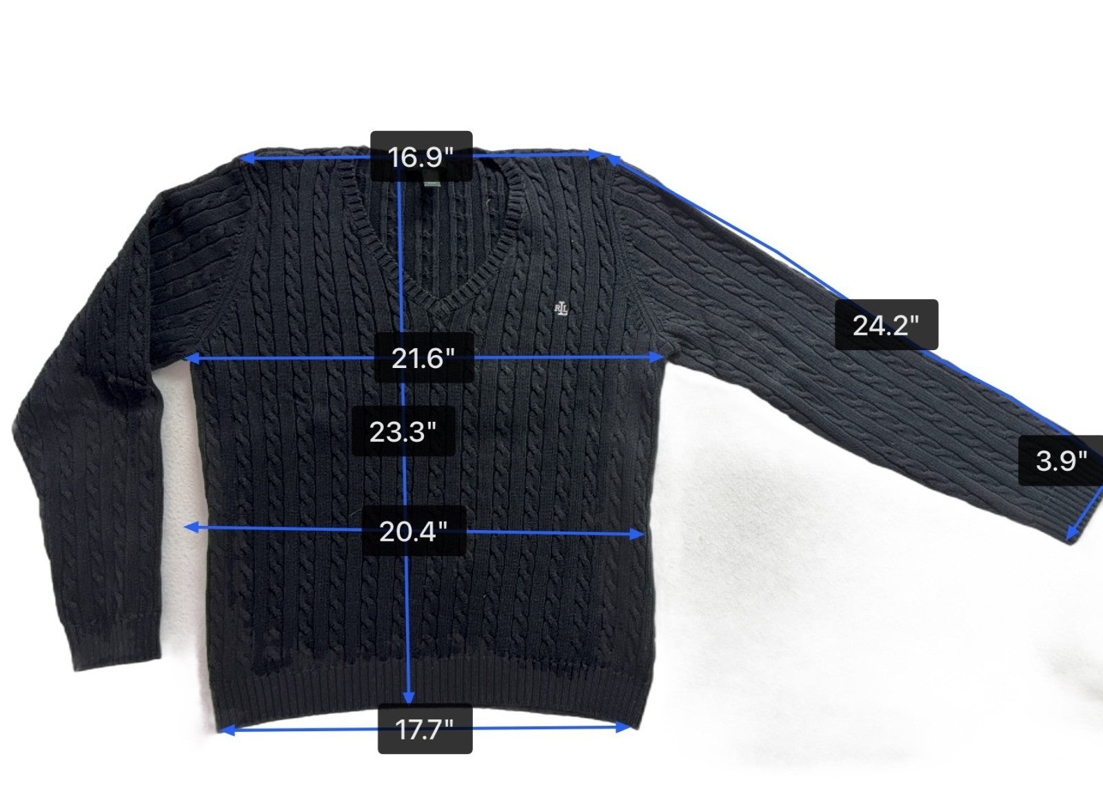 This Lauren Ralph Lauren Women's Black Cotton Cable Knit V-Neck Sweater in size XL features a timeless design with a soft, breathable material. Made entirely of cotton, it boasts a detailed cable knit texture, long sleeves, and ribbed trims for structure. The black color lends versatility for any outfit pairing.