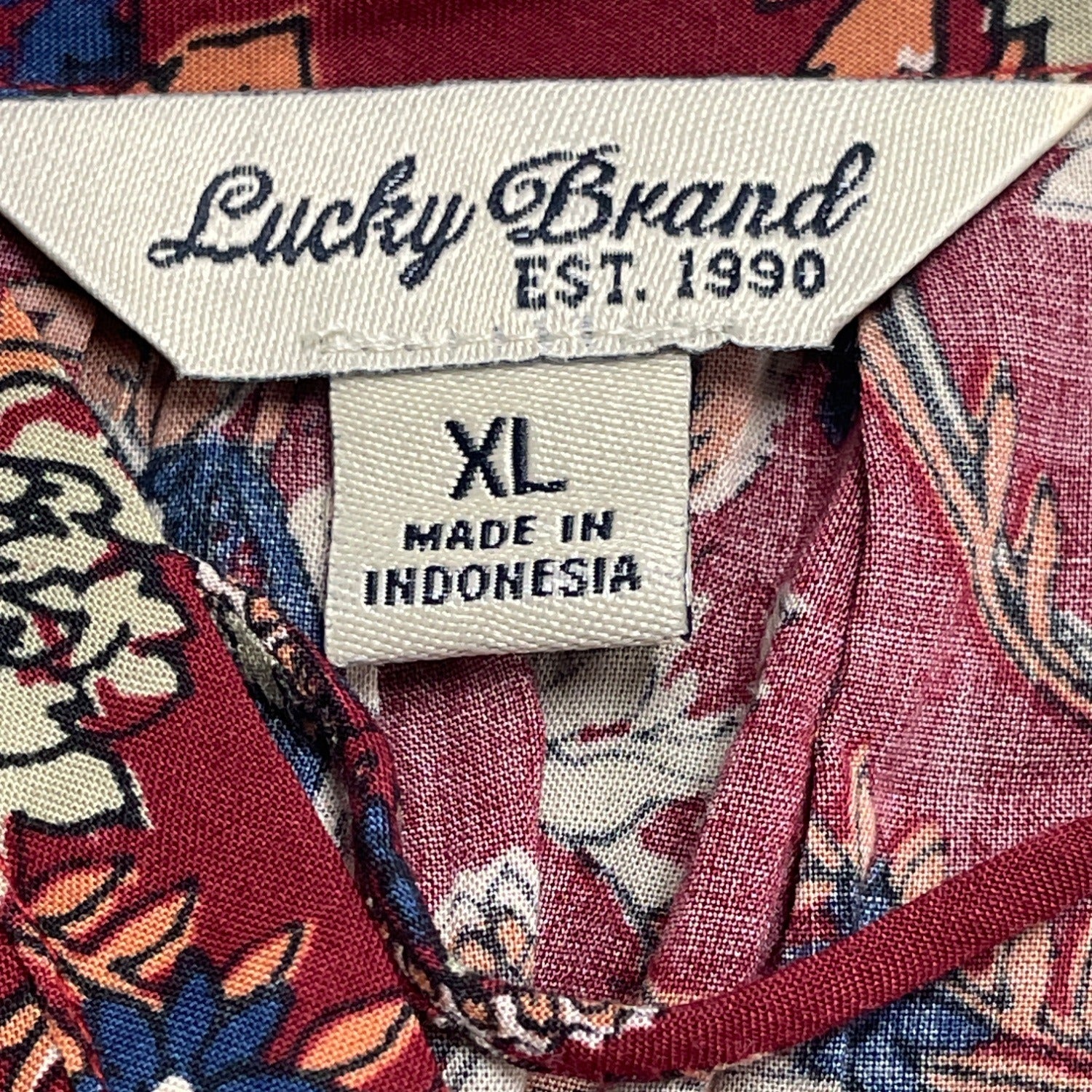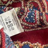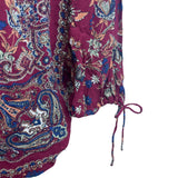 This Lucky Brand women's peasant top features a maroon floral print with boho vibes. The relaxed fit is crafted with lightweight 100% rayon for breathability and comfort. It includes a keyhole tie neckline, tie-cuff sleeves, and a border paisley print. Made in Indonesia. Excellent pre-owned condition.