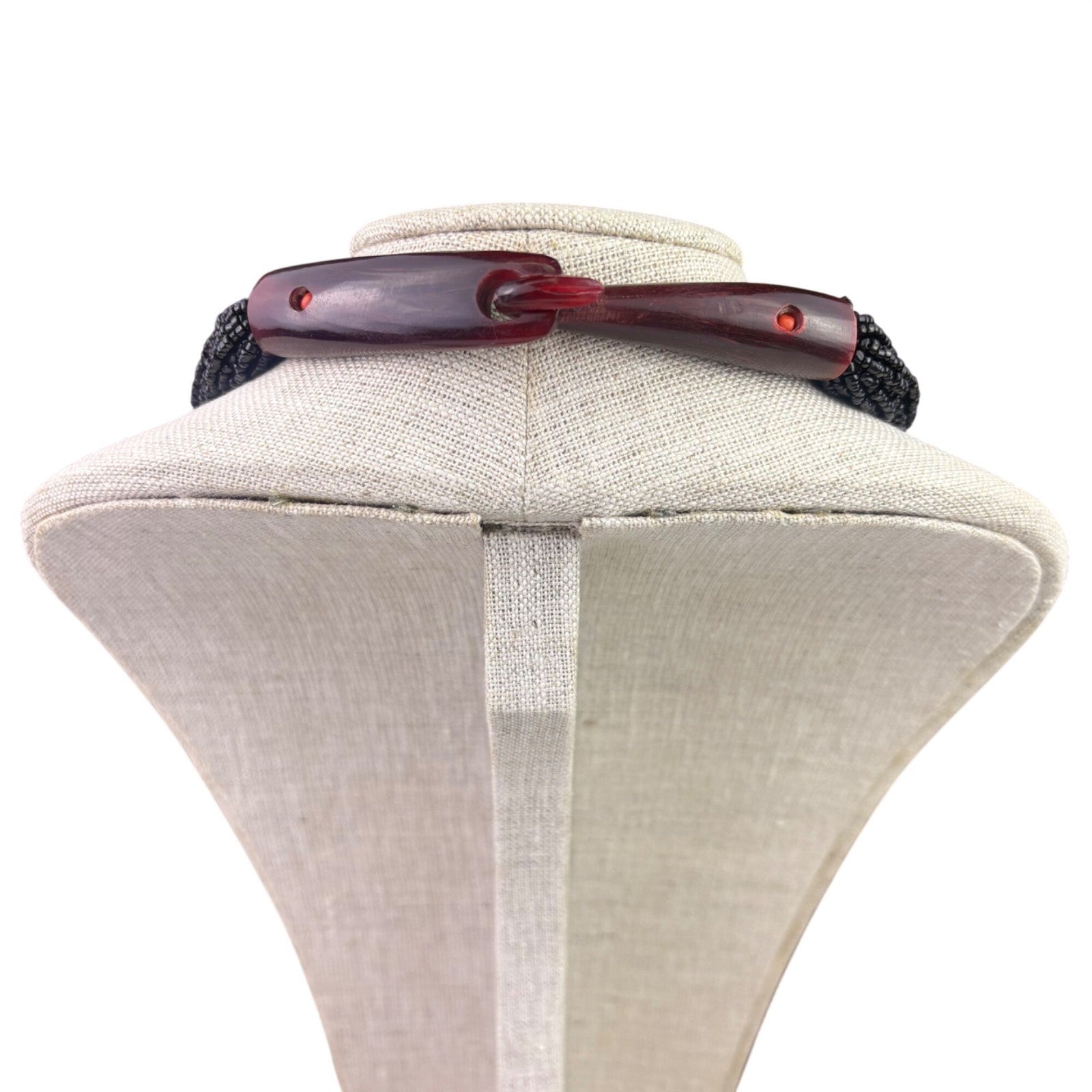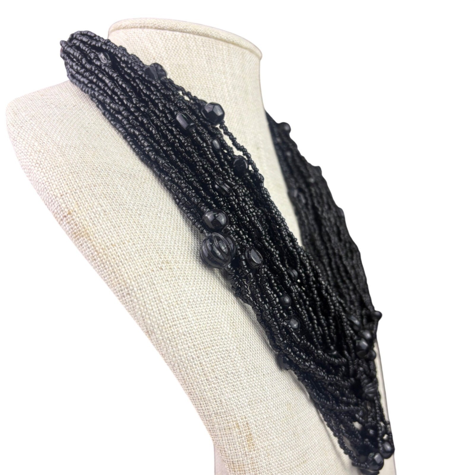 Vintage Black Glass Beads Multistrand Necklace With Unique Red Clasp Design