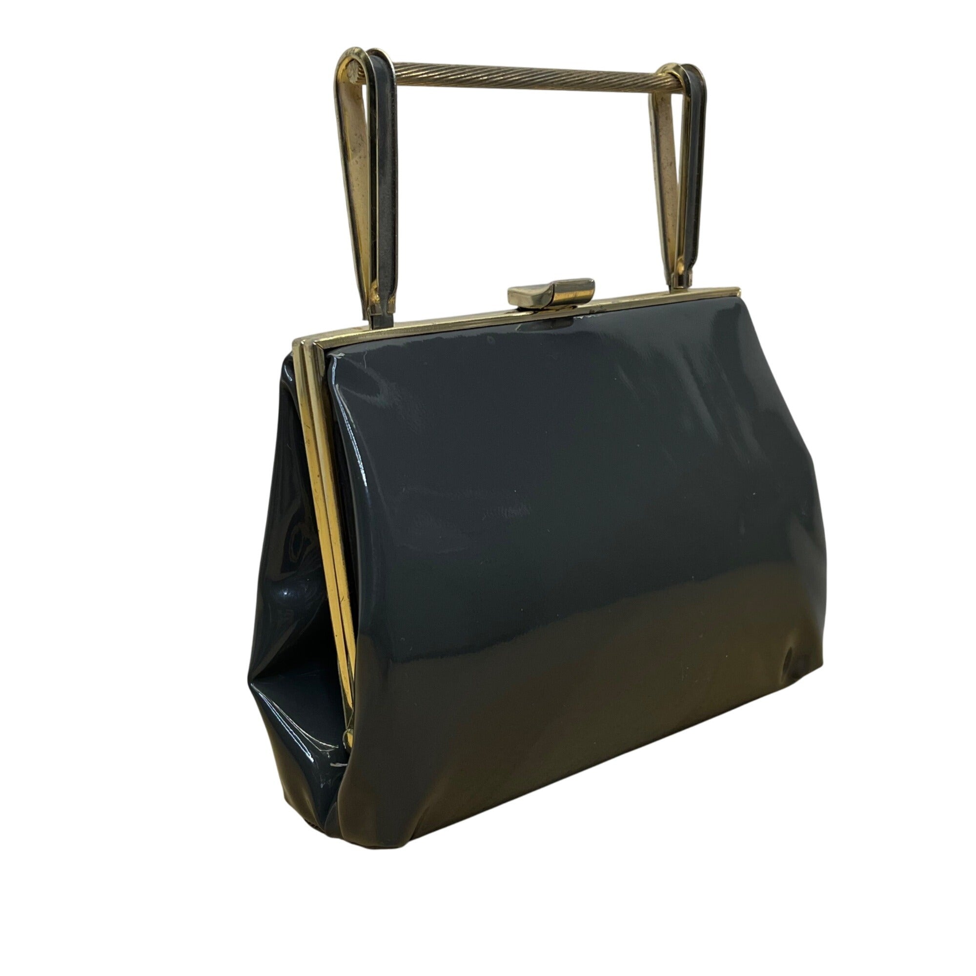 Vintage Black Handbag With Gold Metal Frame & Top Handle Glossy Patent Finish