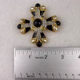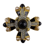 AFJ Vintage Gold Tone Black Enamel Faux Pearl Rhinestone Maltese Cross Brooch
