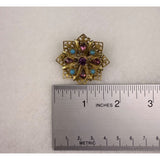 Vintage Gold Tone Starburst Brooch With Purple & Blue Stones Filigree Design