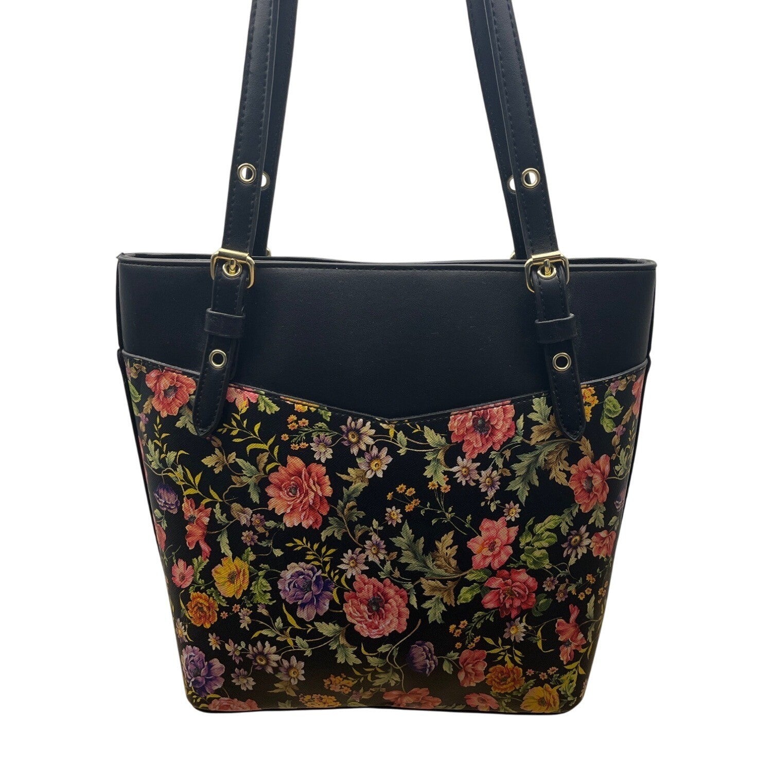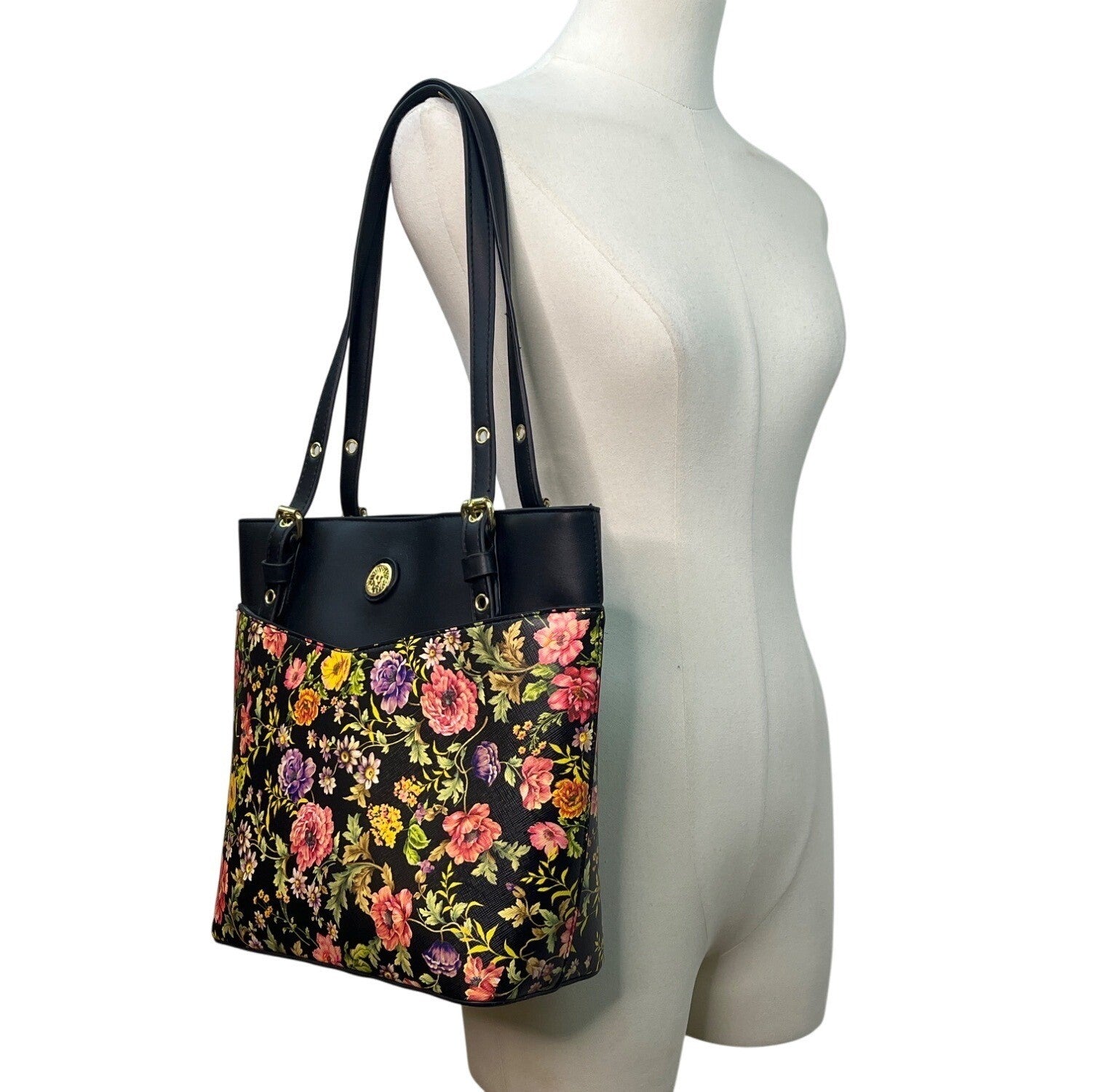 Anne Klein Floral Print Black Faux Leather Gold Accent Zipper Closure Tote Bag