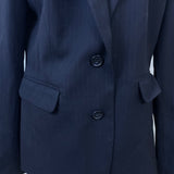 This Banana Republic women's blazer combines professional elegance with a sleek, tailored fit. Crafted from a durable black polyester blend, it features subtle pinstripes, a two-button closure, notched lapels, flap pockets, and a back vent for ease of movement. Unlined sleeves include four functional buttons at the cuffs. The blazer is in excellent condition with no flaws or defects. Designed for business or formal occasions, this classic piece ensures effortless sophistication. Made in China.