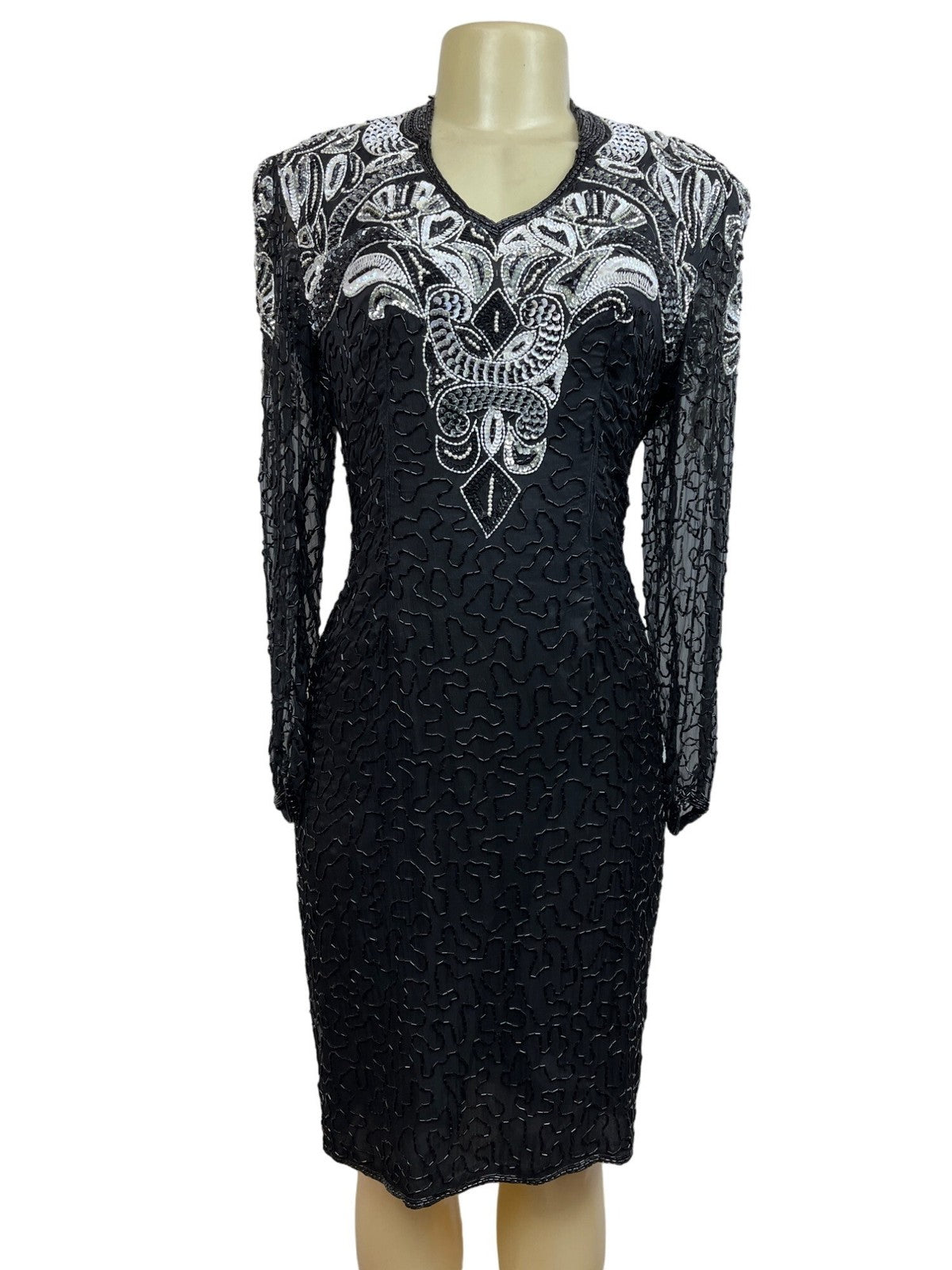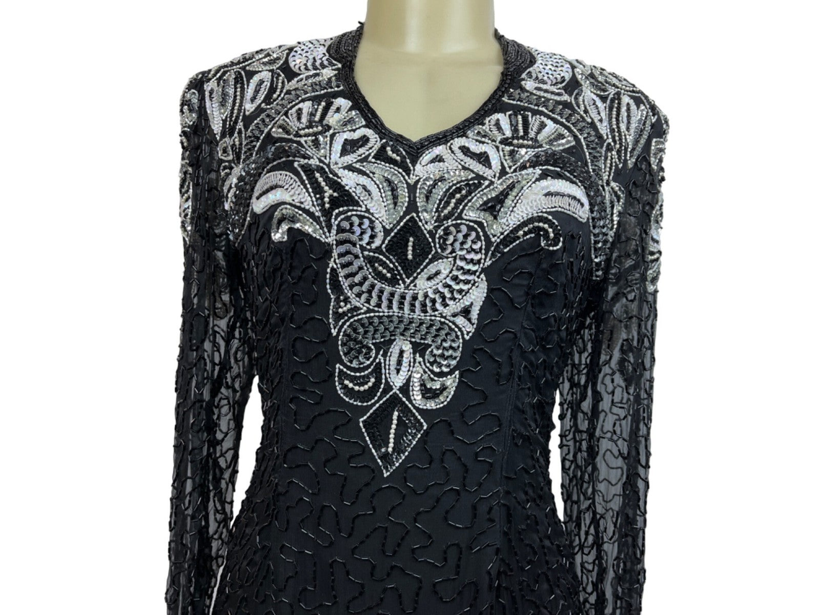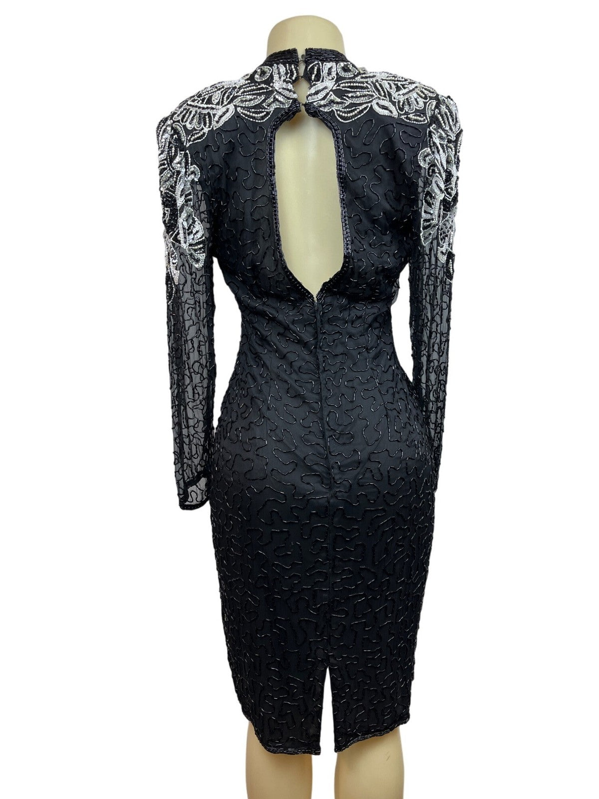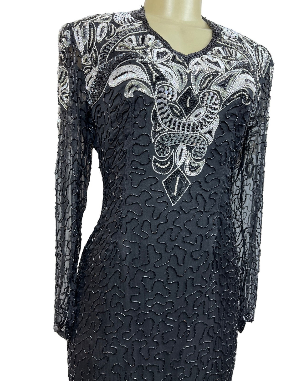 Black & Silver Sequin Beaded Womens Dress Long Sleeve Elegant Design Size M