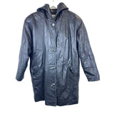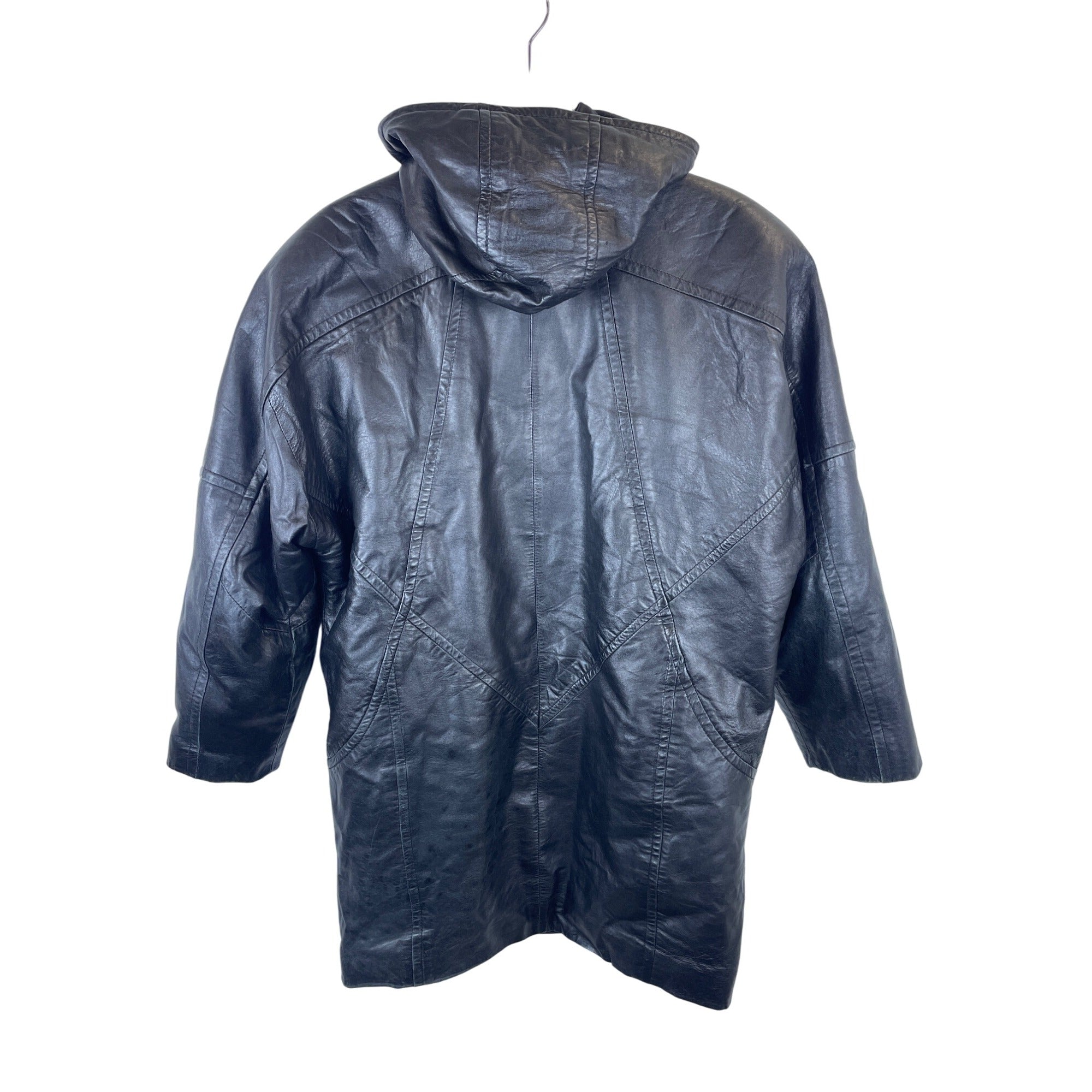This black leather hooded coat features a button-front closure, full-length design, and soft inner lining. Stylish and functional for cooler weather. Size: Large.