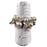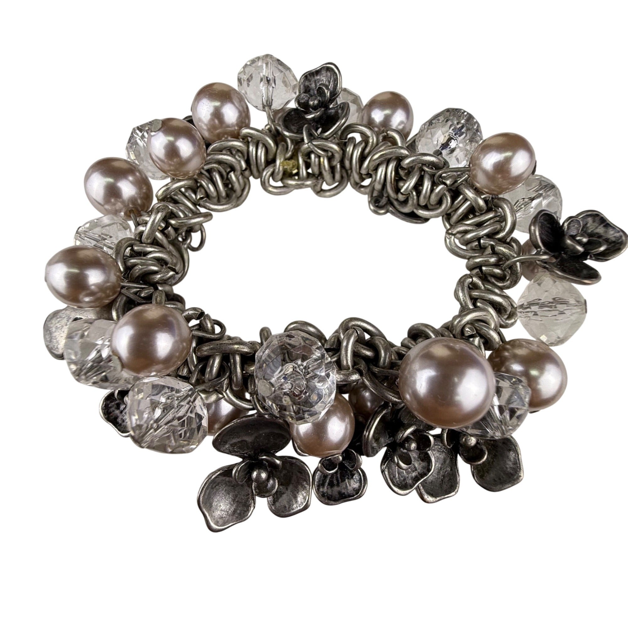 Chunky Silver Tone Bracelet W/ Pearl Beads & Floral Accents 6.5 7.5 Stretch
