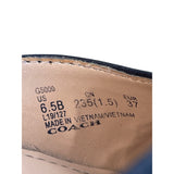 These Coach women's black leather mules feature a sleek pointed-toe design and bold gold buckle accents on the straps. Made in Vietnam, they pair luxurious craftsmanship with a versatile slip-on style. The rubber outsoles have a Coach logo imprint, providing added grip. Some minor scuffing is visible at the toe area, which does not affect the functionality or overall appeal. Stamped size 6.5B.
