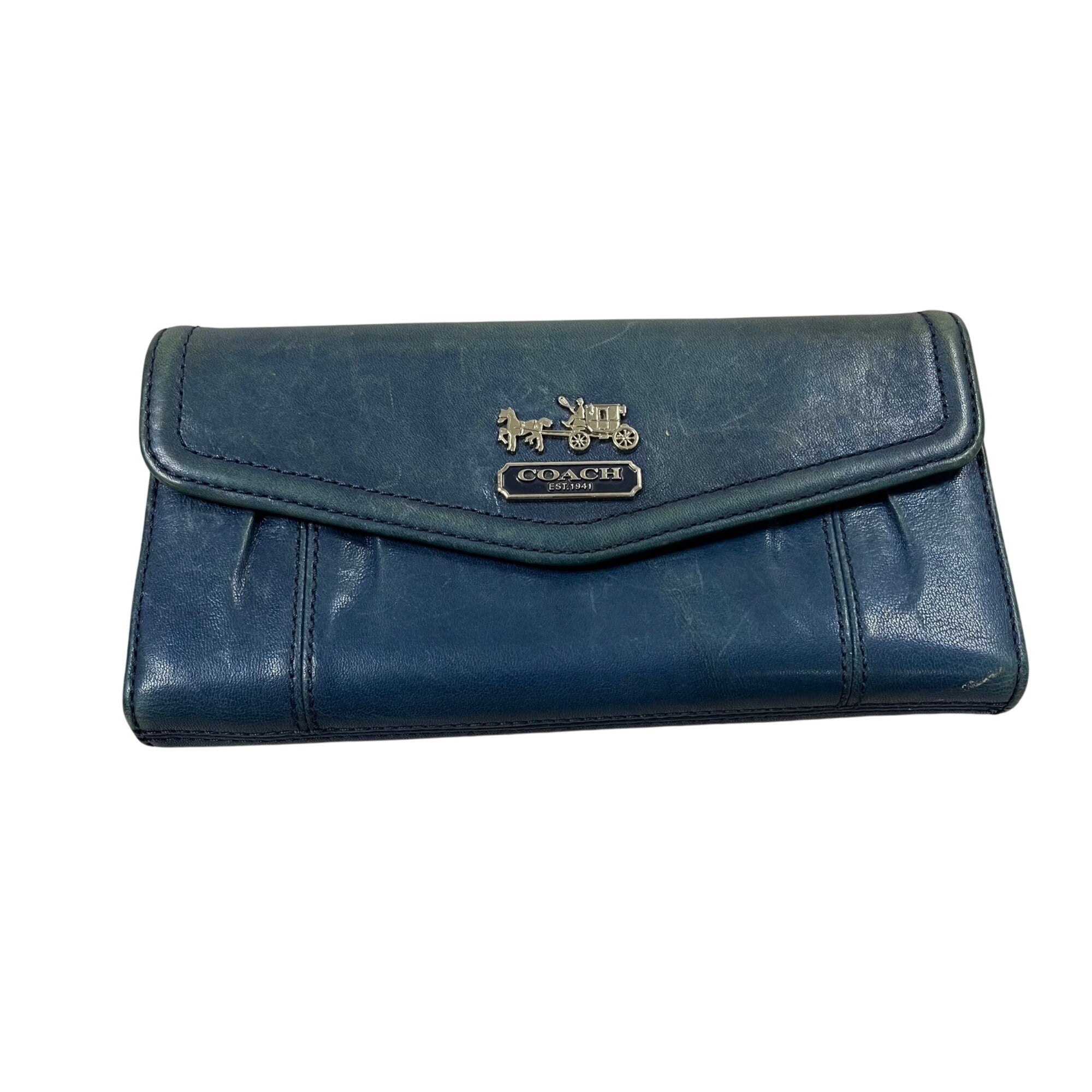 Navy leather wallet with Coach horse & carriage logo, envelope-style flap, and ample space for essentials. Durable, classic, and timeless design.