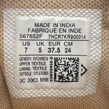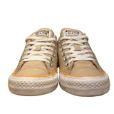 Classic beige low-top canvas sneakers featuring textured rubber soles with speckled orange details, durable metal eyelets, and lace-up closure. Comfortable and stylish for versatile wear.