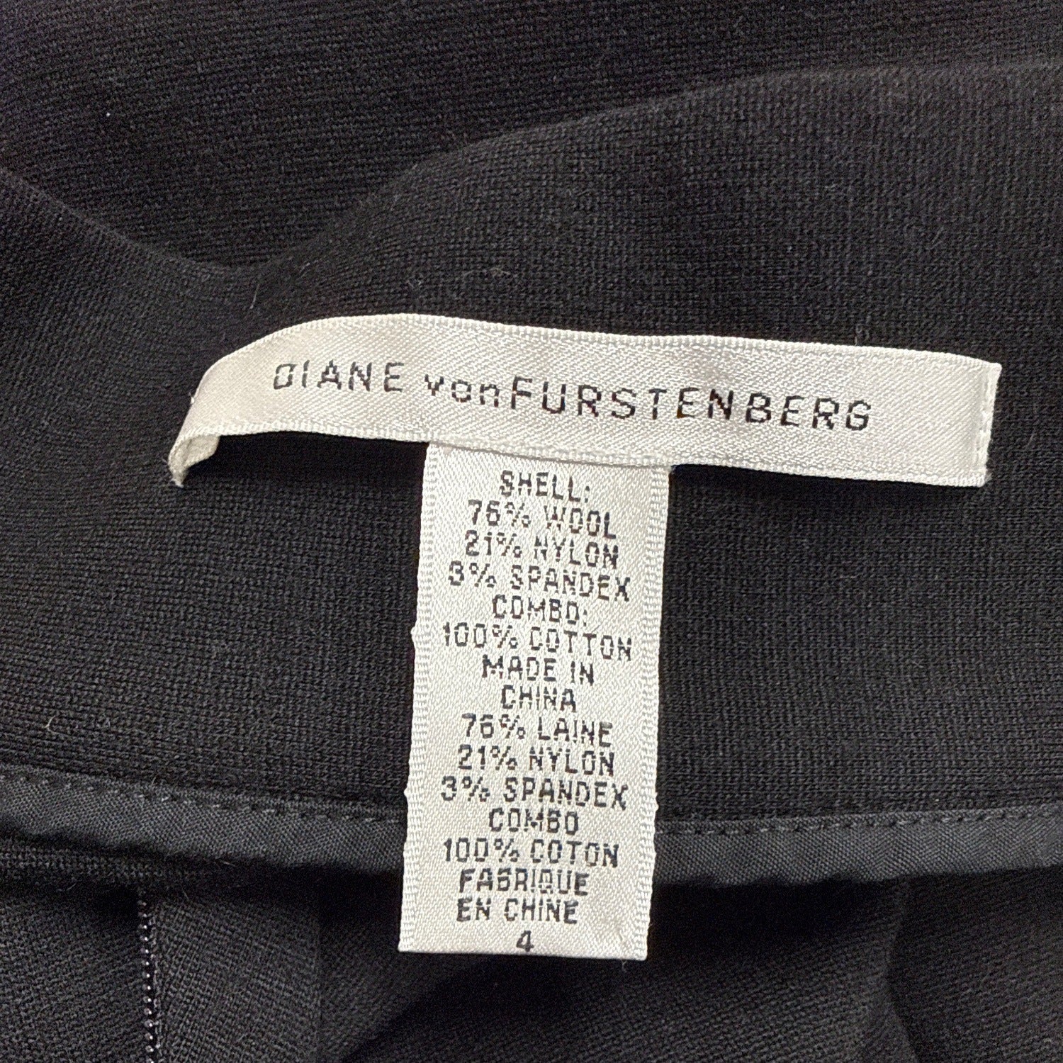 Diane VonFurstenberg Women's Black Wool Blend Pencil Skirt Size 4 High Waist Design. Crafted from a luxurious blend of 76% wool and 21% nylon with a touch of stretch from 3% spandex. Features a slim, fitted silhouette with a structured waistband and invisible side zipper closure for a smooth finish. Designed with a versatile knee-length cut, making it a great choice for a variety of occasions. Made in China.