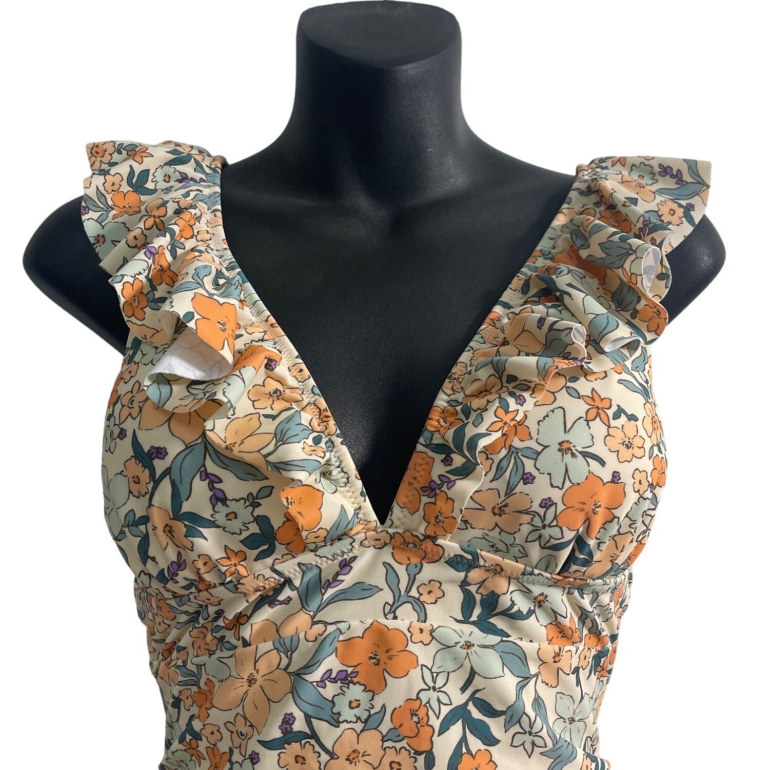Floral Ruffled One Piece Swimsuit By Cupshe M Polyester & Spandex Blend Orange & Green Floral Print