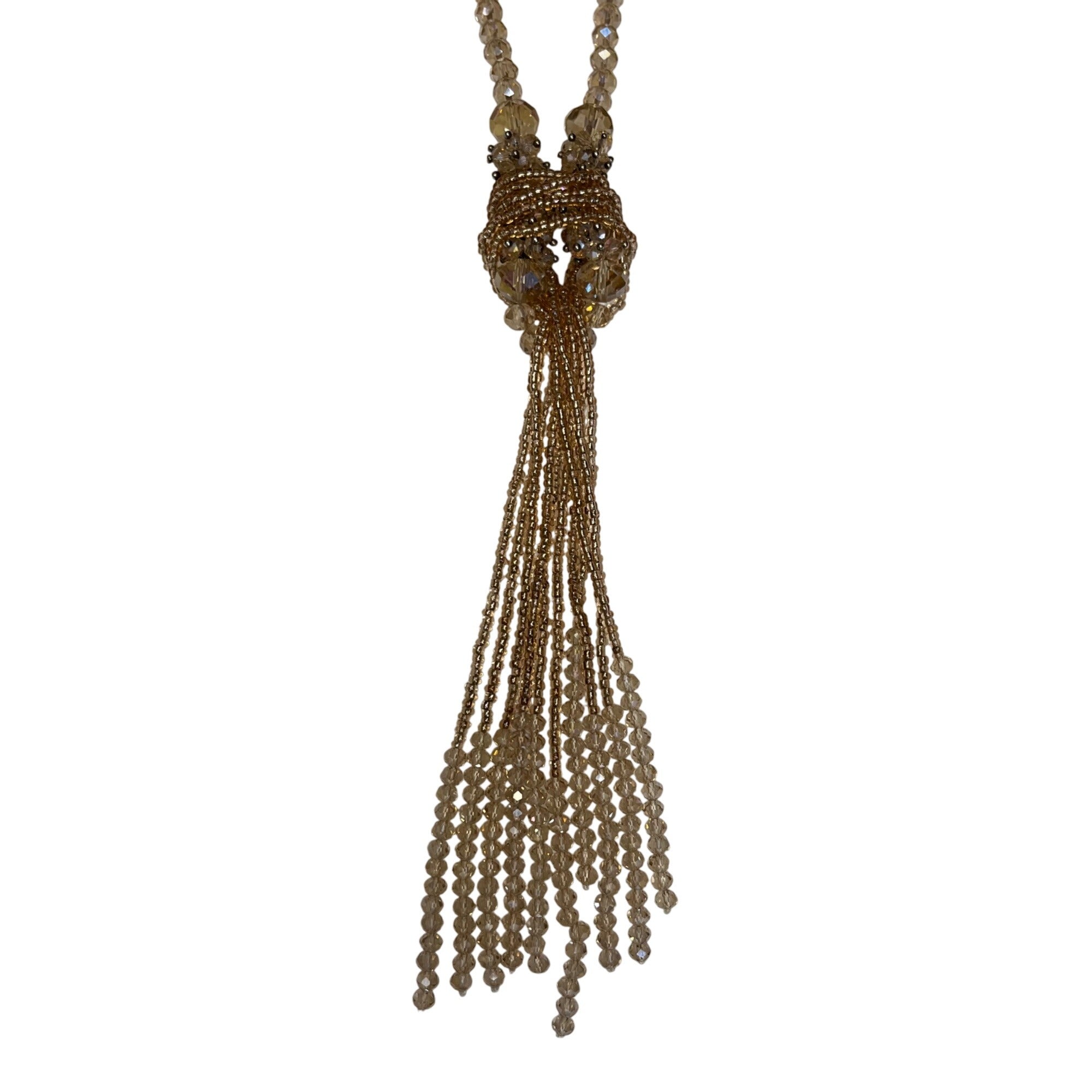 Gold Beaded Tassel Necklace With Crystal Accents Knot Detail Long Strand Jewelry