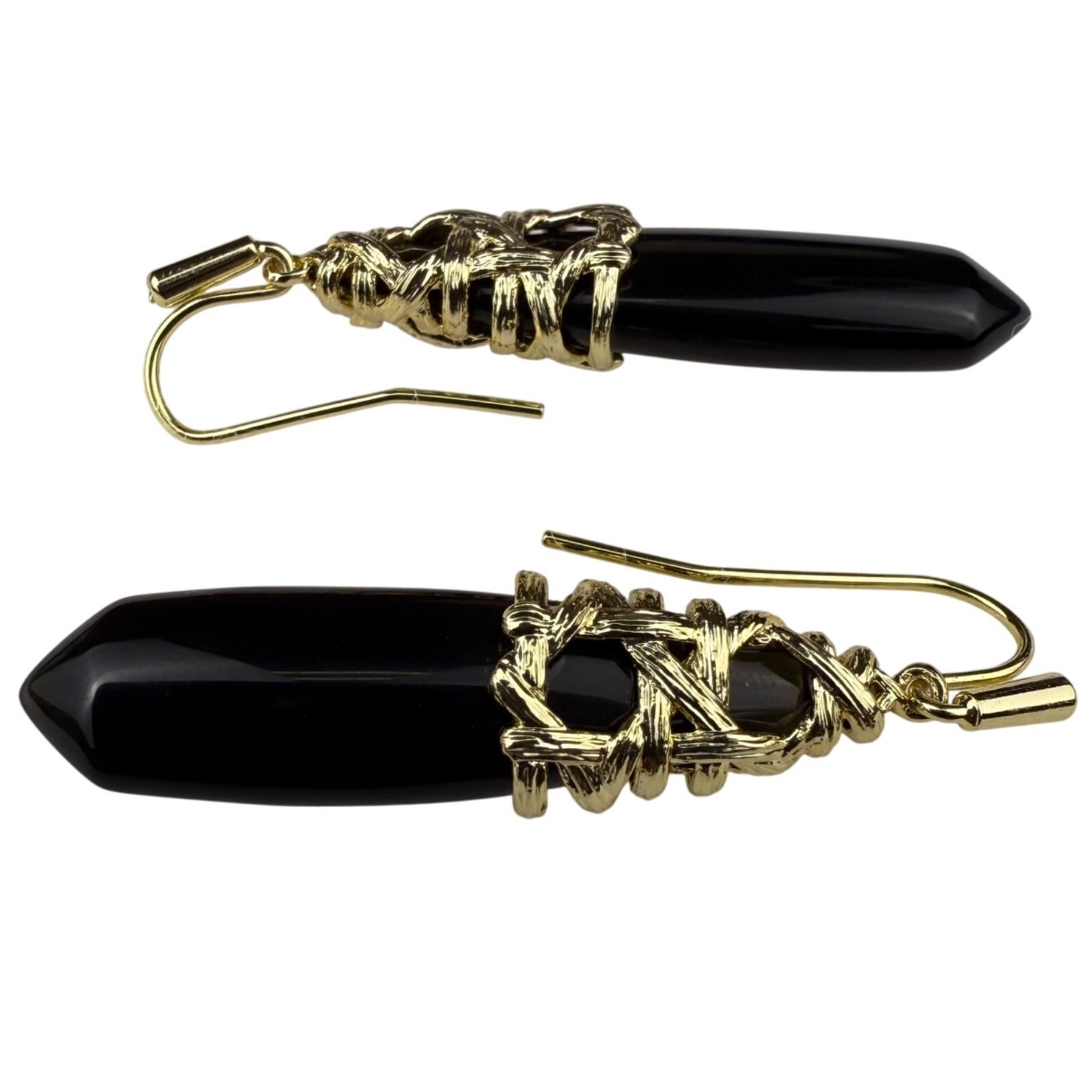 Gold Tone Black Stone Wire Wrap Dangle Earrings Handmade Lightweight 2 Inch Drop