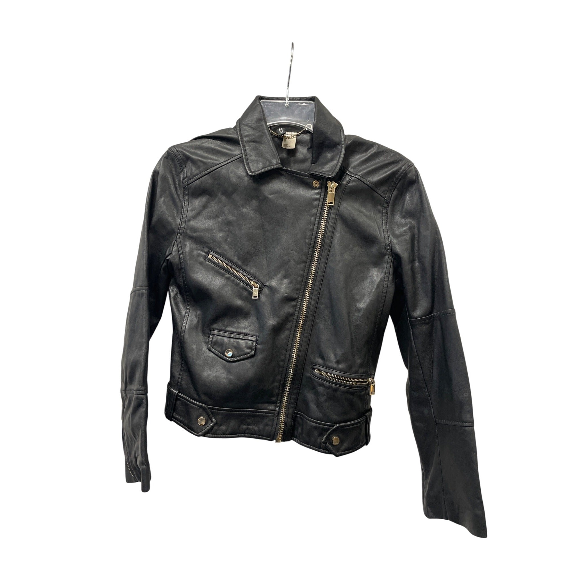 Crafted by H&M Divided, this women's black faux leather biker jacket features a stylish asymmetrical zip closure, silver-toned hardware, and snap details. Complete with zippered cuffs, functional front pockets, and a comfortable polyester lining, it offers both fashion and versatility. Suitable for transitional weather.