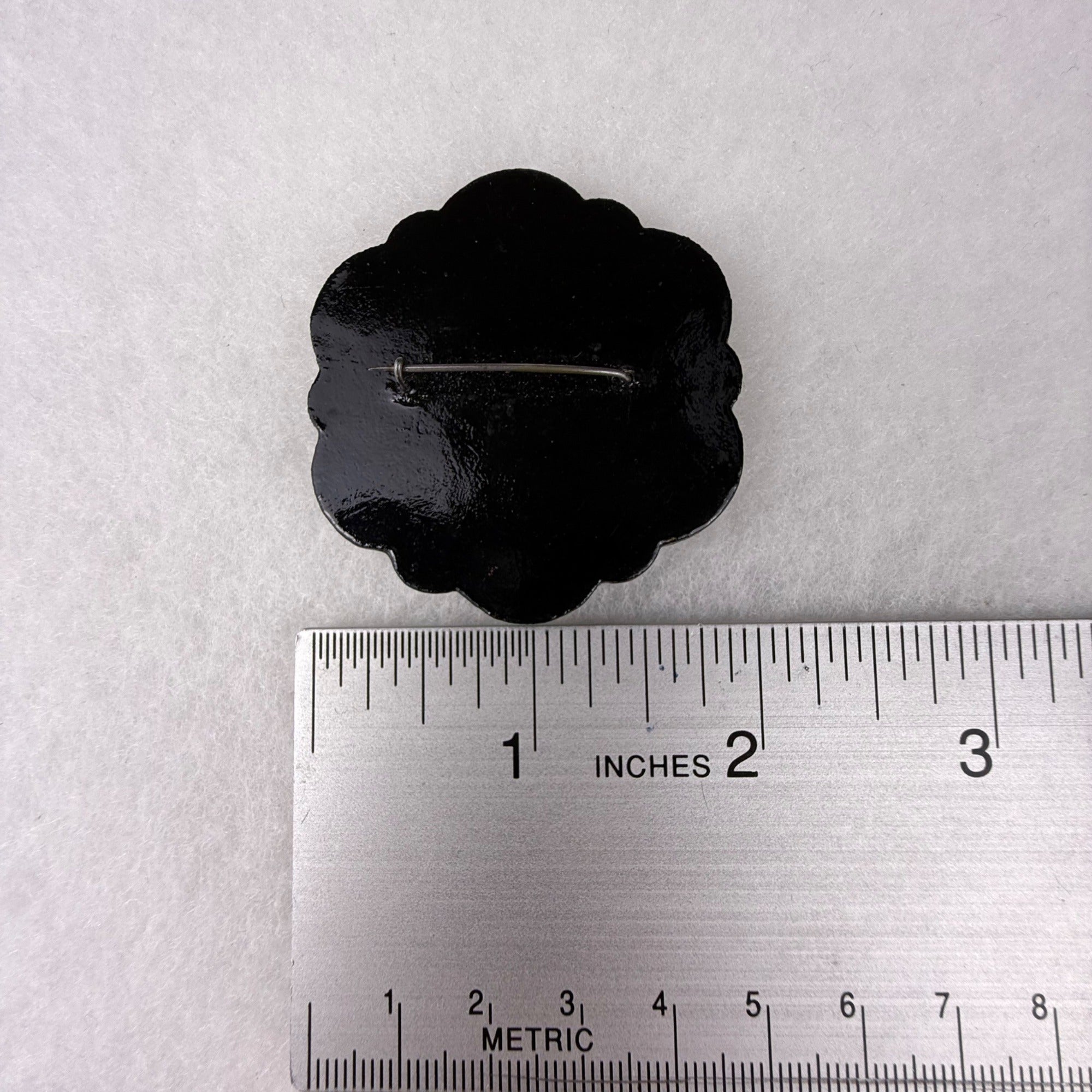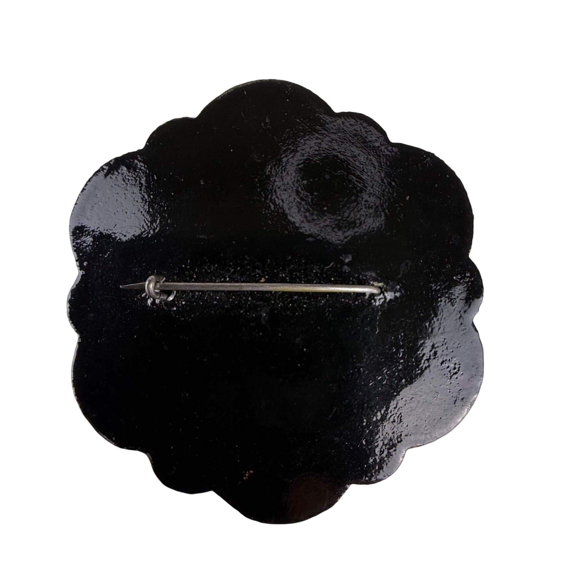 Hand-Painted Vintage Russian Lacquer Brooch Green Black Scalloped Scene Pin