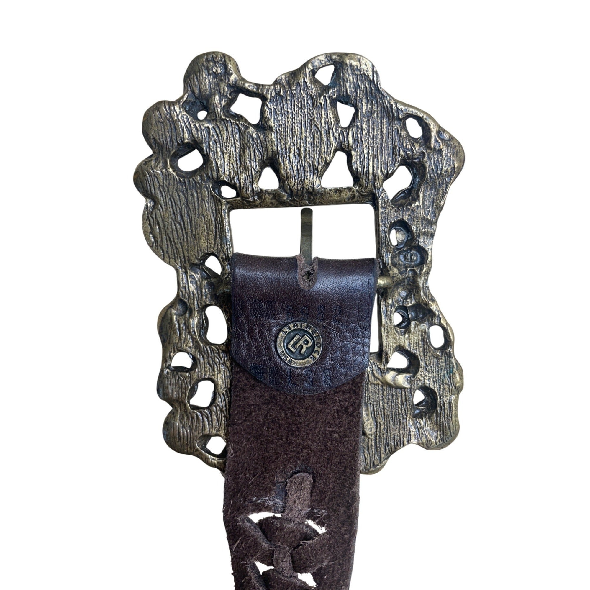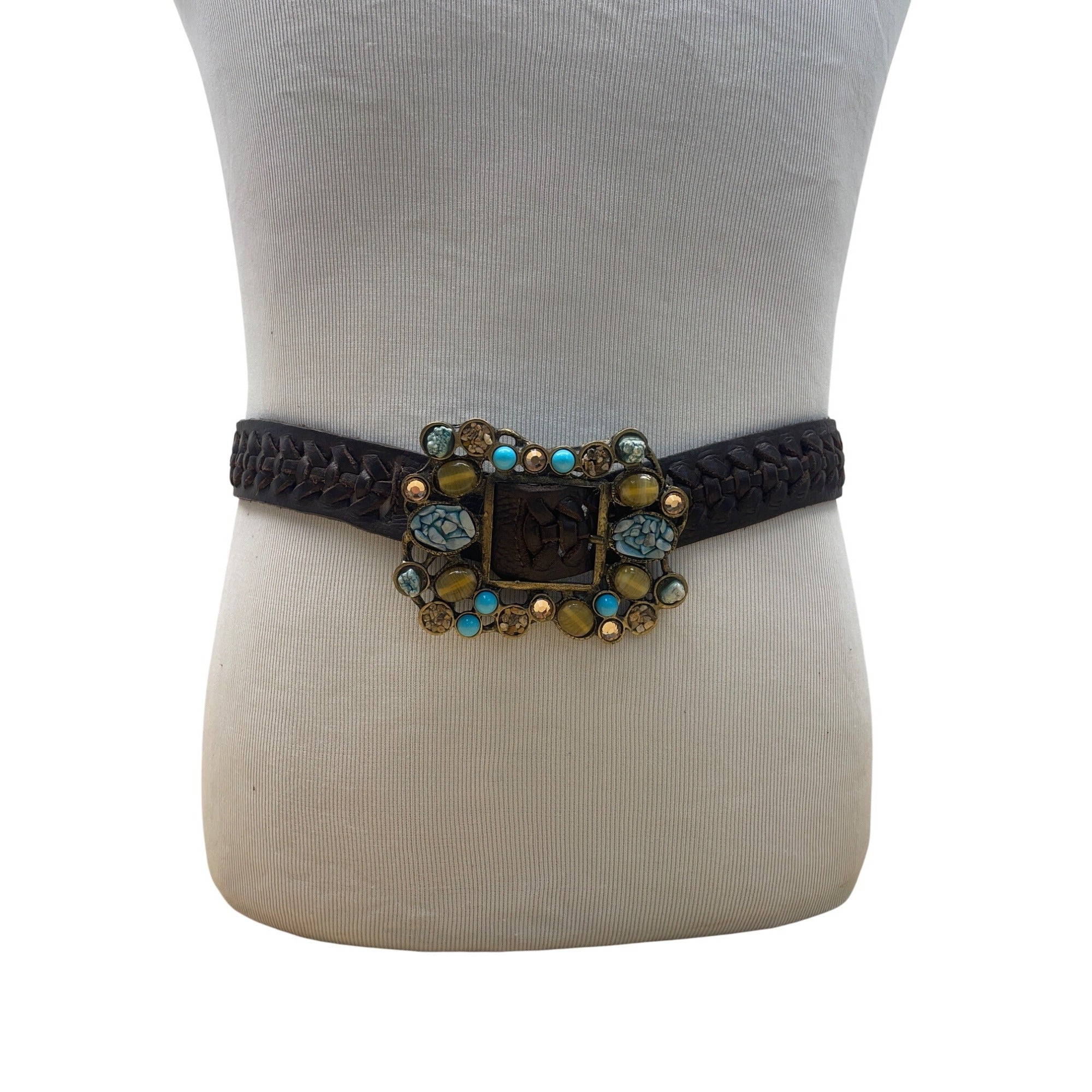 Handcrafted Brown Braided Leather Belt With Gemstone Embellished Buckle