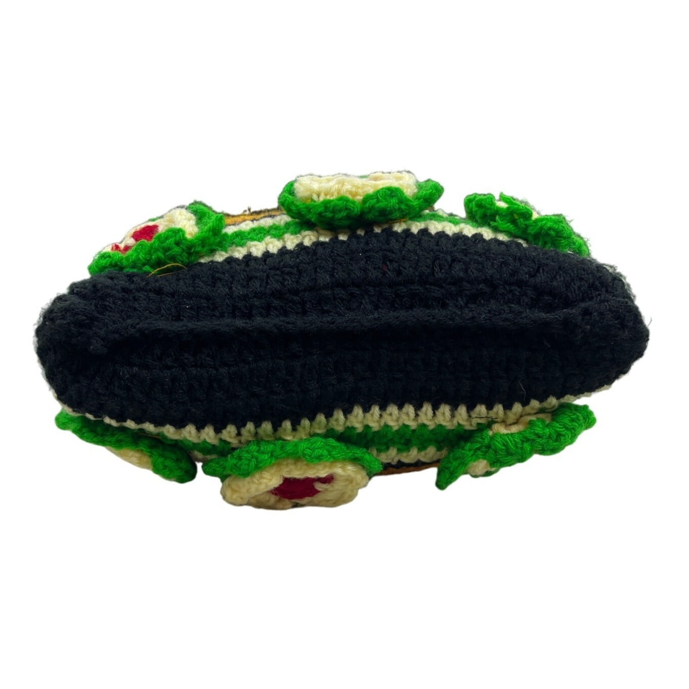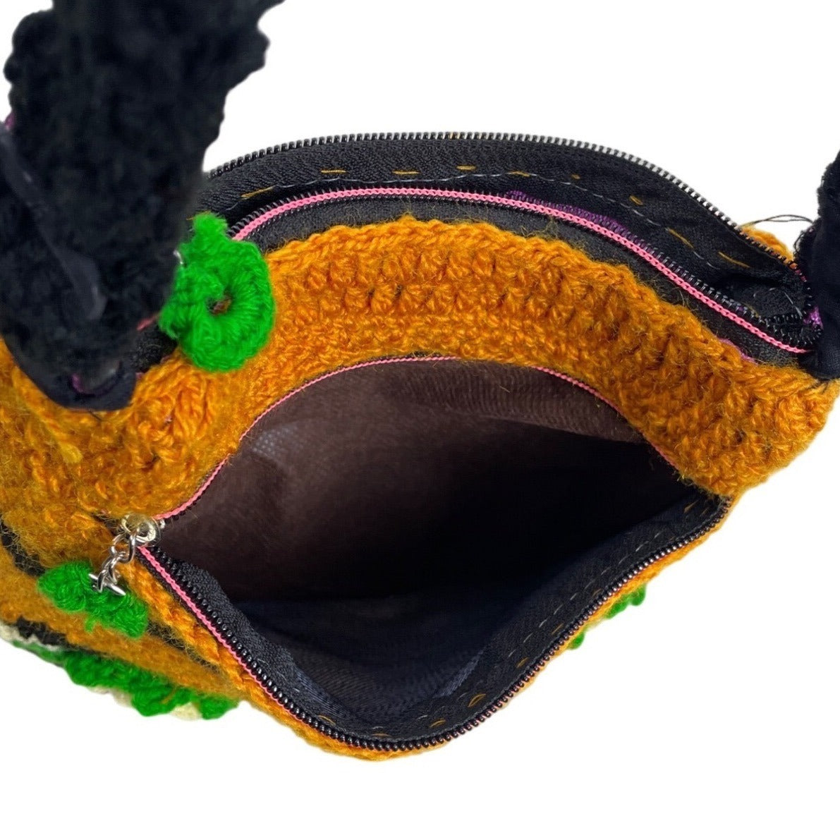 Bright orange, small sized, unbranded girls purse knitted with flower art and bee pattern. Made of wool, it's perfect for women who appreciate unique accessories.
