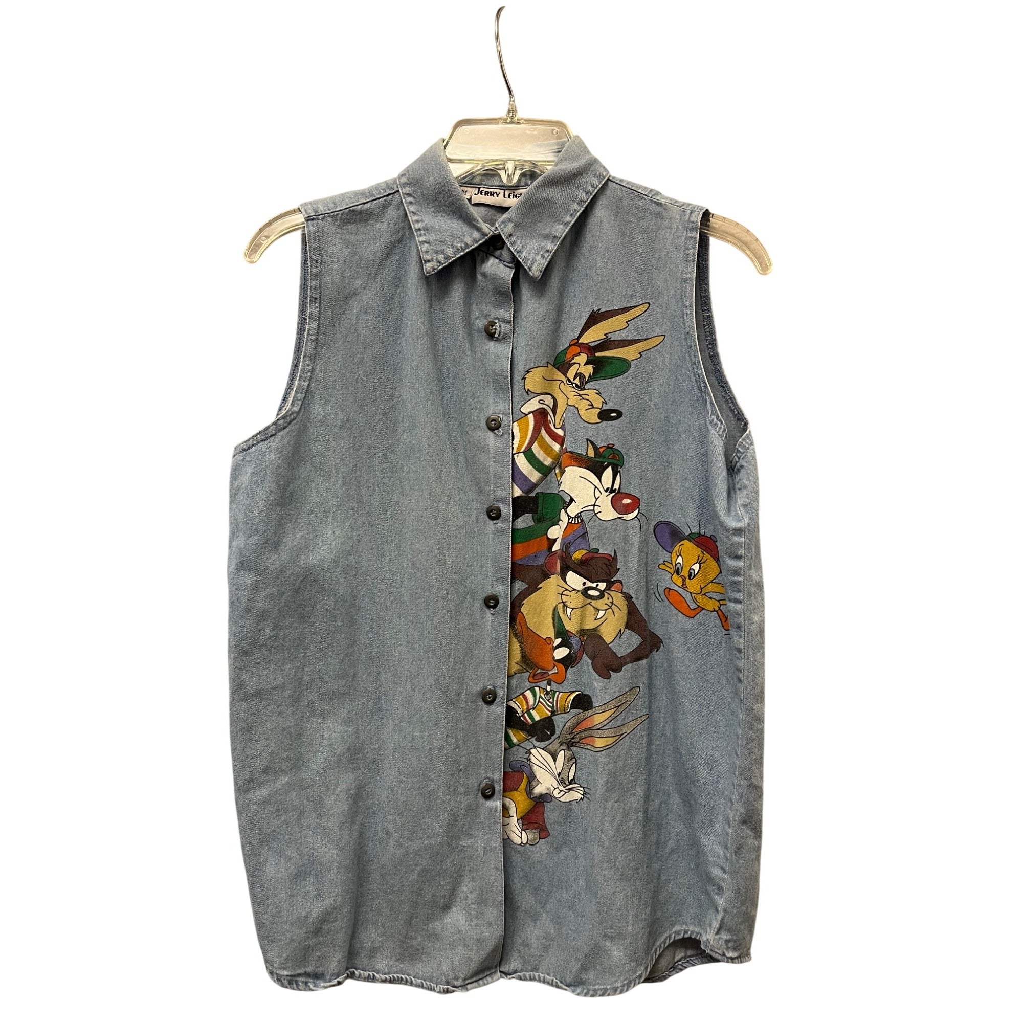Jerry Leigh Womens Blue Denim Sleeveless Button-Up Shirt Looney Tunes Graphic M