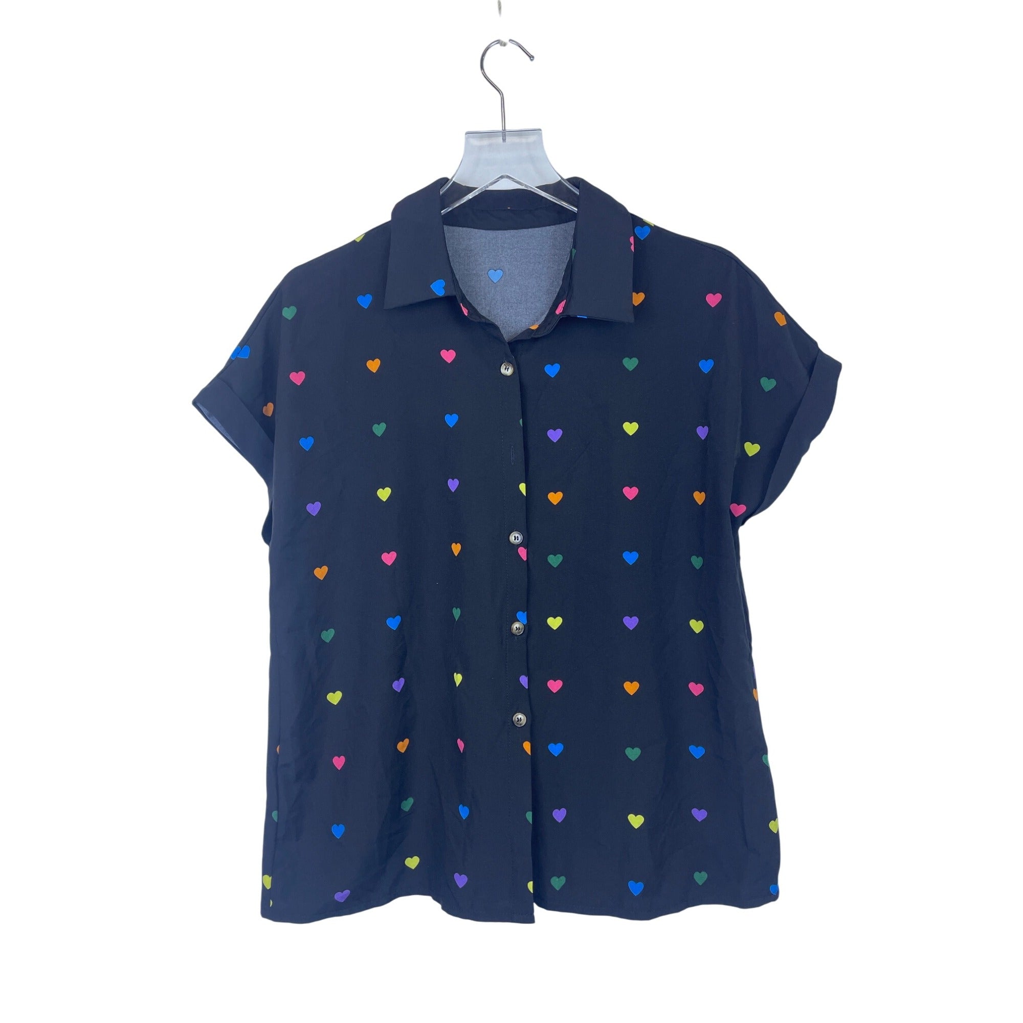 Shein Womens Black Button-Up Shirt With Colorful Heart Pattern Size Medium