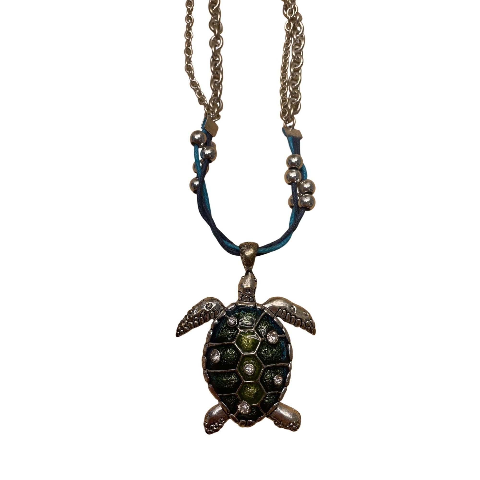 Silver & Blue Turtle Pendant Necklace With Chain & Beaded Details