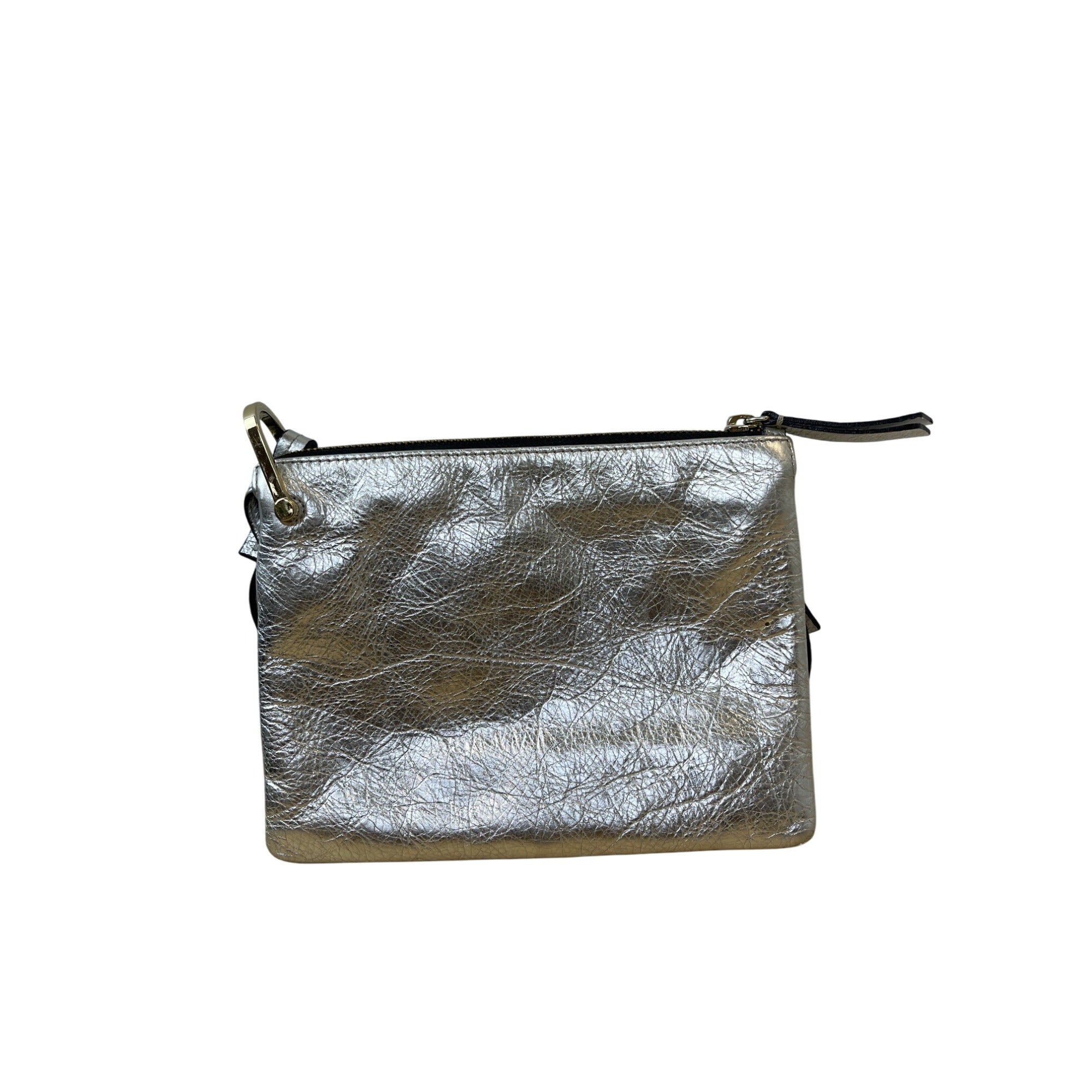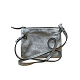 Silver Metallic Leather Crossbody Bag Dual Zippers Adjustable Strap Compact Size Stylish Durable