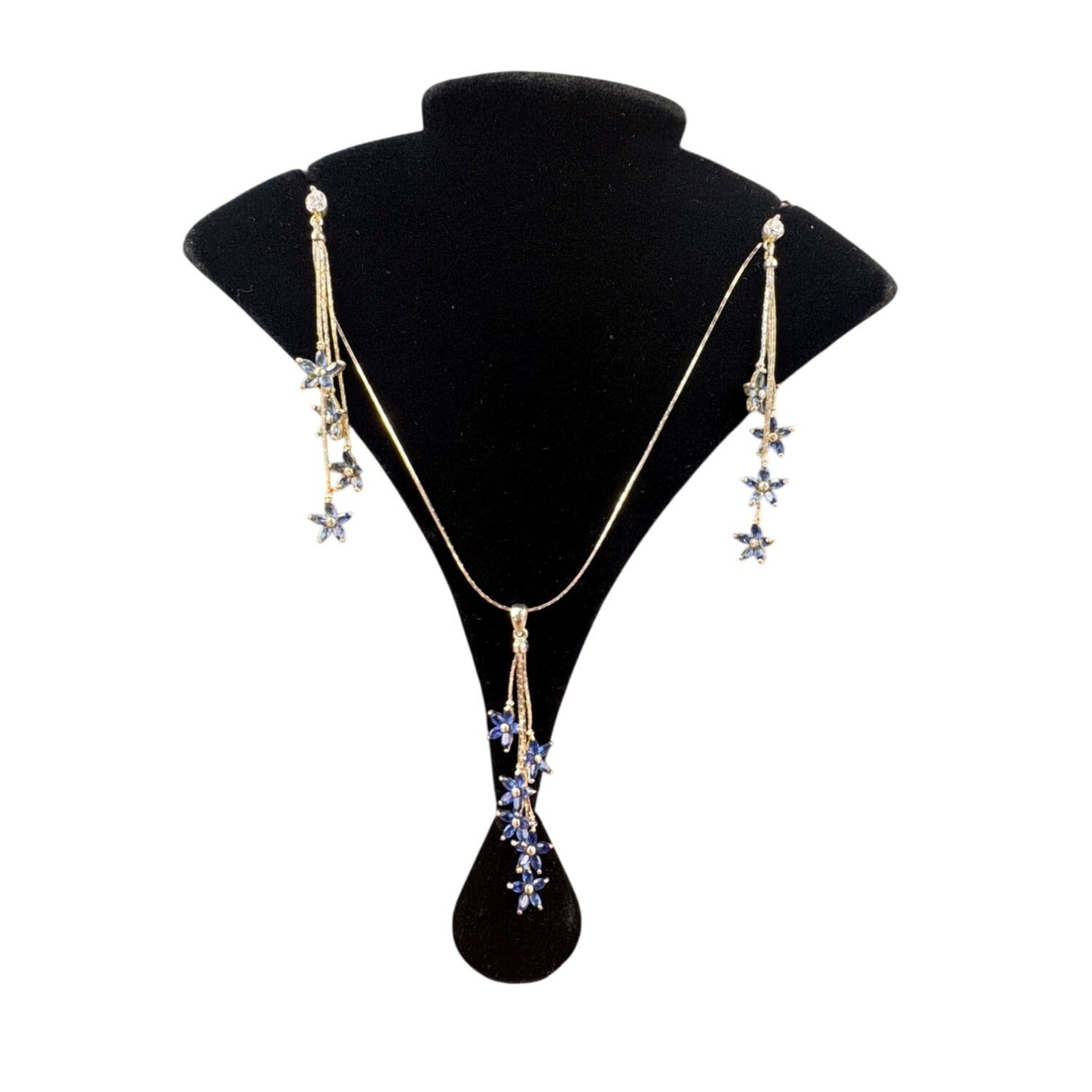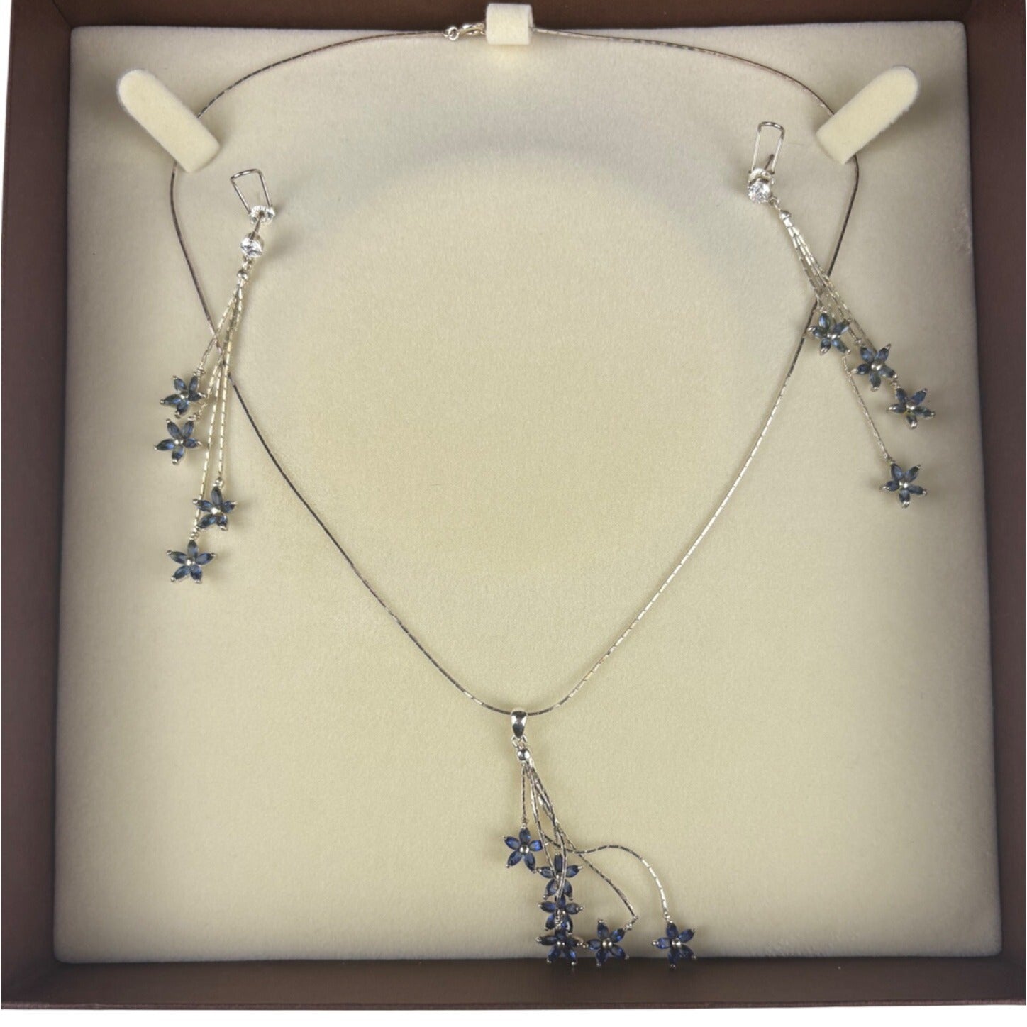 Sterling Silver Womens Blue Crystal Floral Necklace & Earrings Set Elegant Design 16" Length