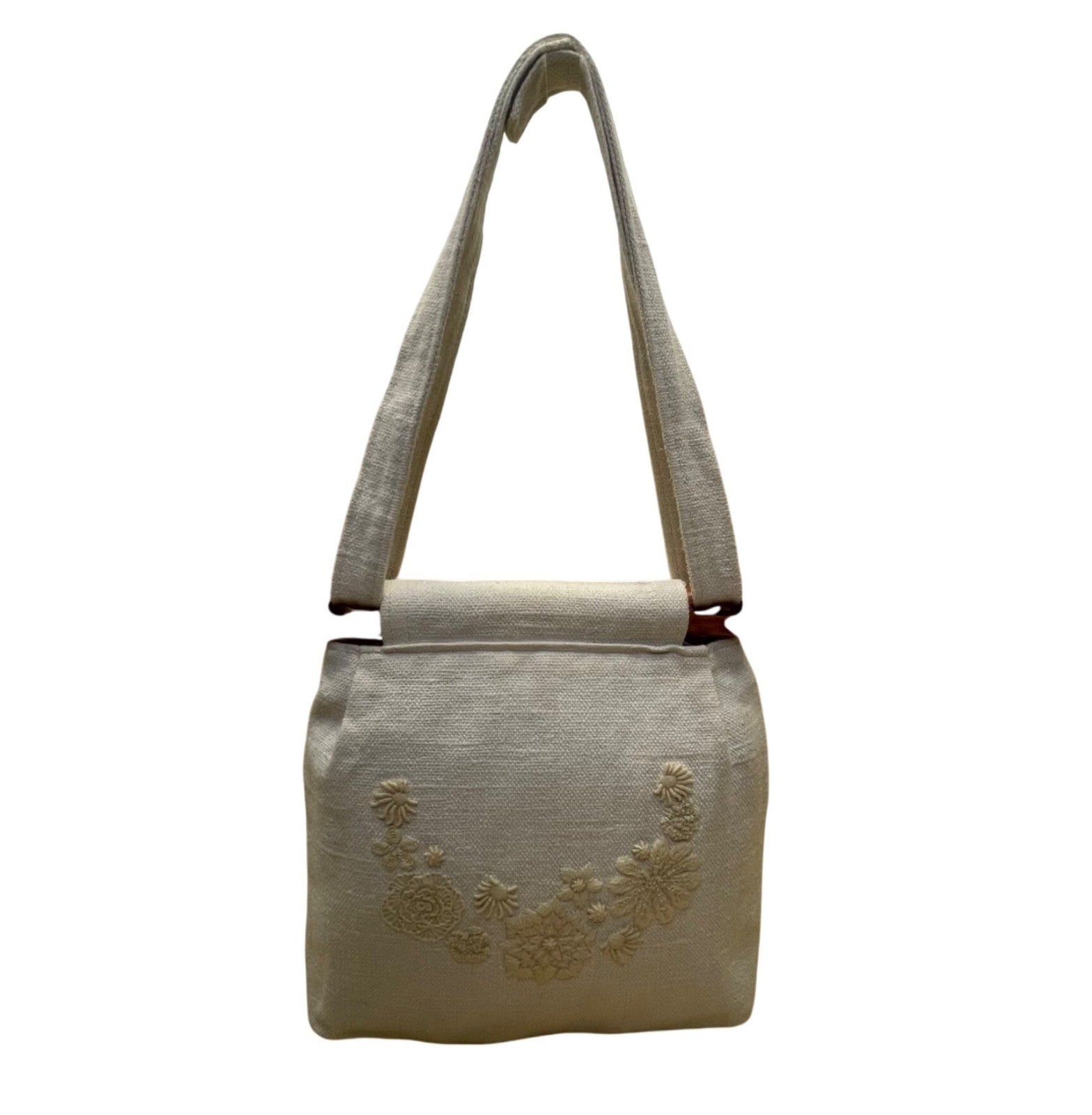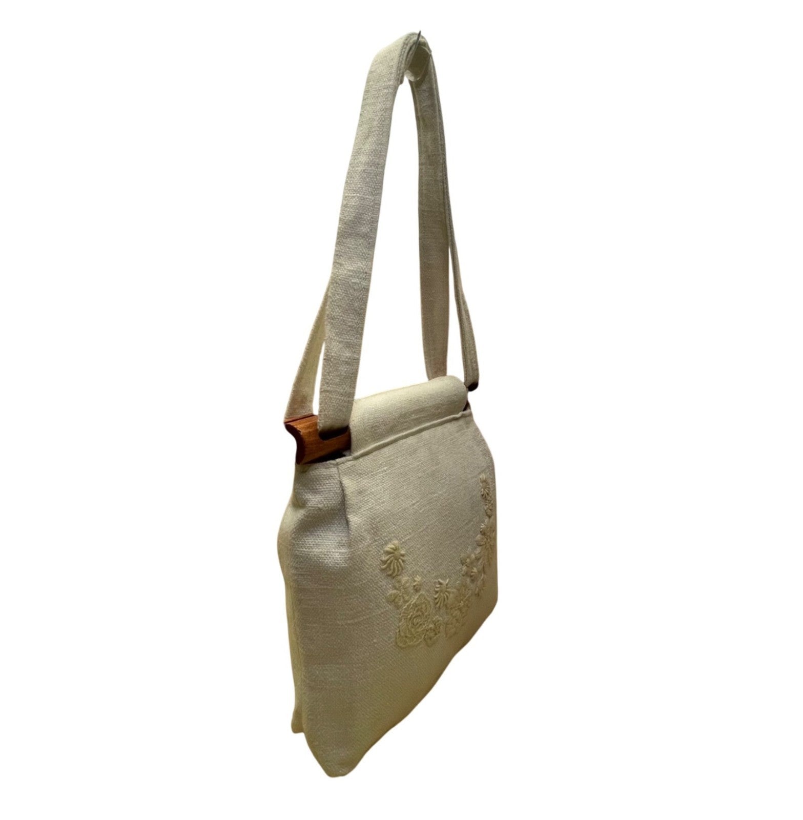 Thistle Needleworks Linen Floral Embroidered With Wooden Accents Shoulder Bag