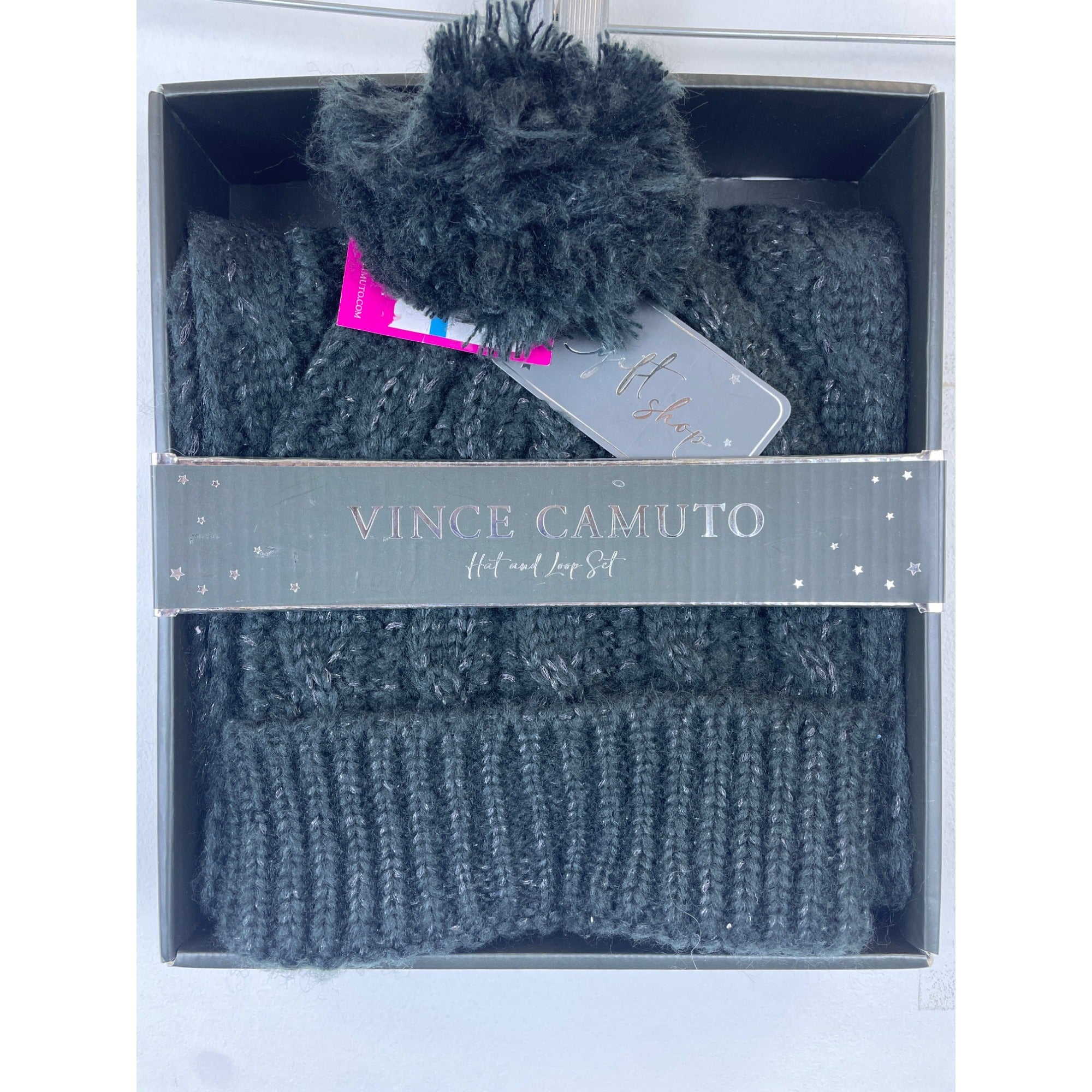 Vince Camuto Women’s Black Knit Hat & Scarf Set With Pom Detail One Size Gift Ready