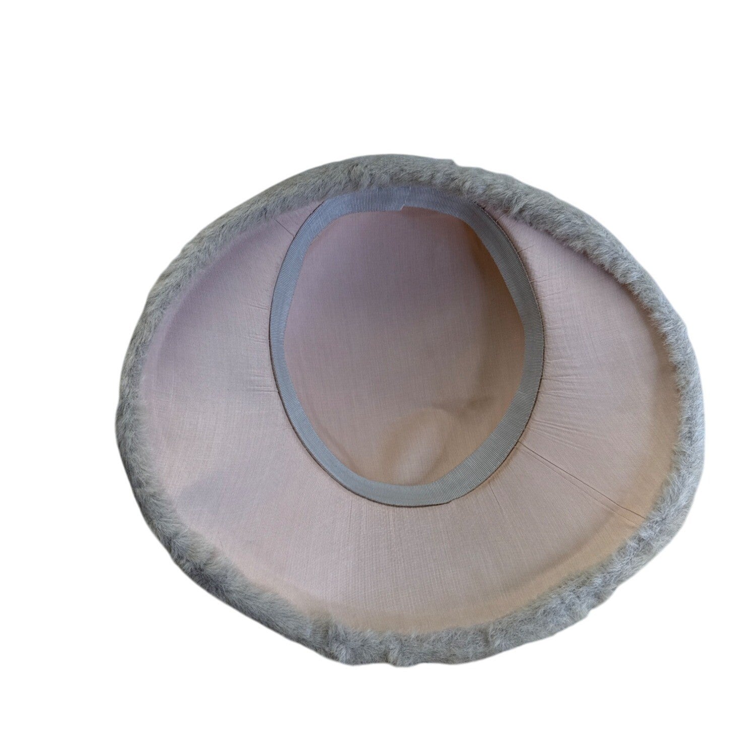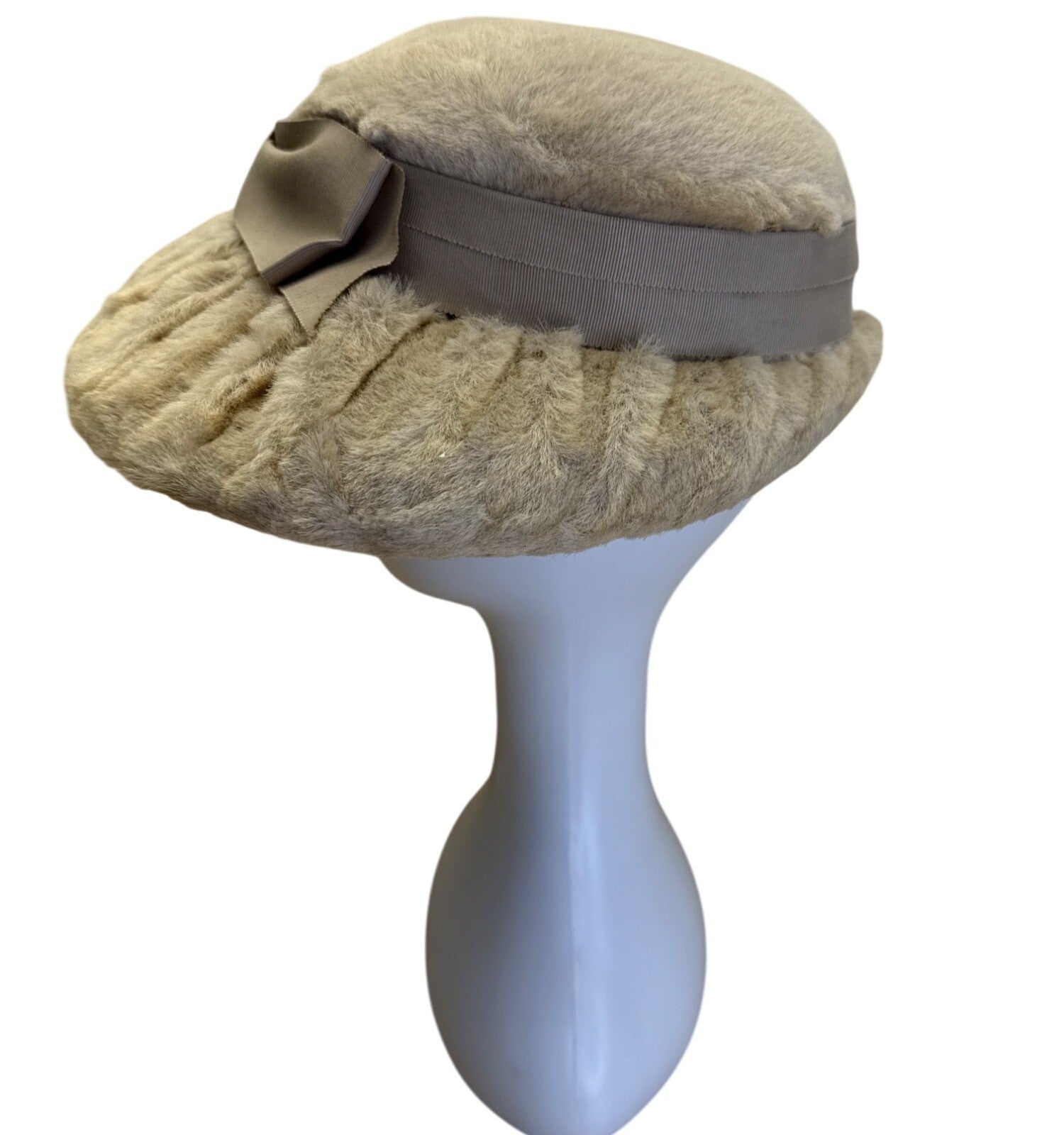 Vintage Beige Faux Fur Womens Hat With Bow Accent & Satin Lining