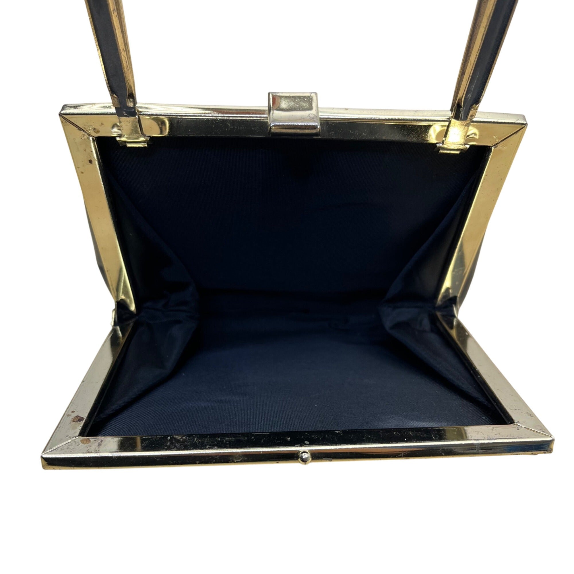 Vintage Black Handbag With Gold Metal Frame & Top Handle Glossy Patent Finish