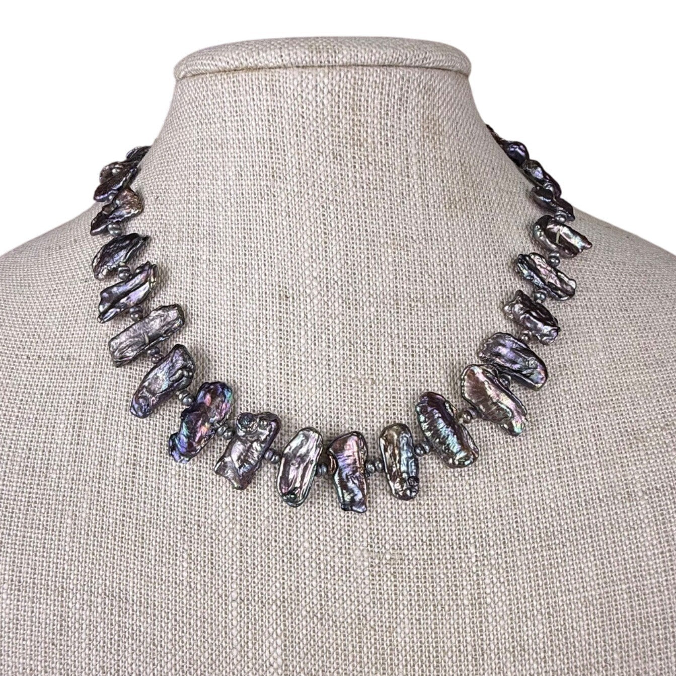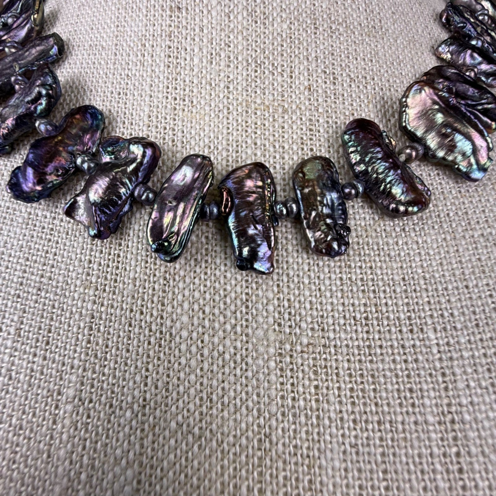 Vintage Freshwater Iridescent Black Pearl Necklace Silver Tone Spacer Beads Magn