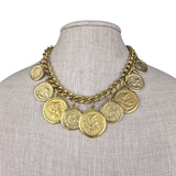 Vintage Gold Tone Coin Medallion Necklace Women Chain Alloy Statement Toggle Design