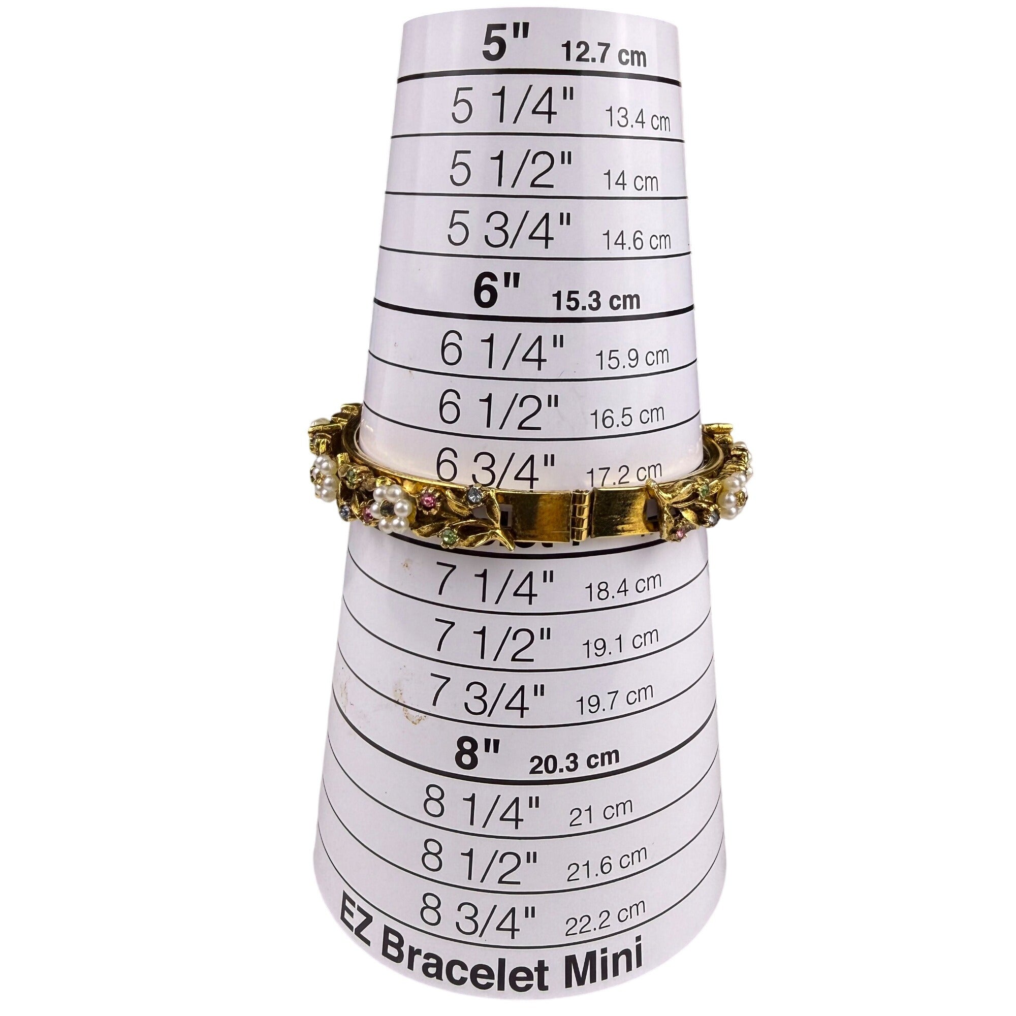 Vintage Gold Tone Rhinestone & Faux Pearl Floral Bangle Bracelet Hinge Clasp