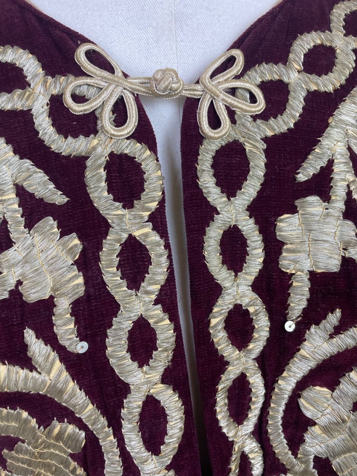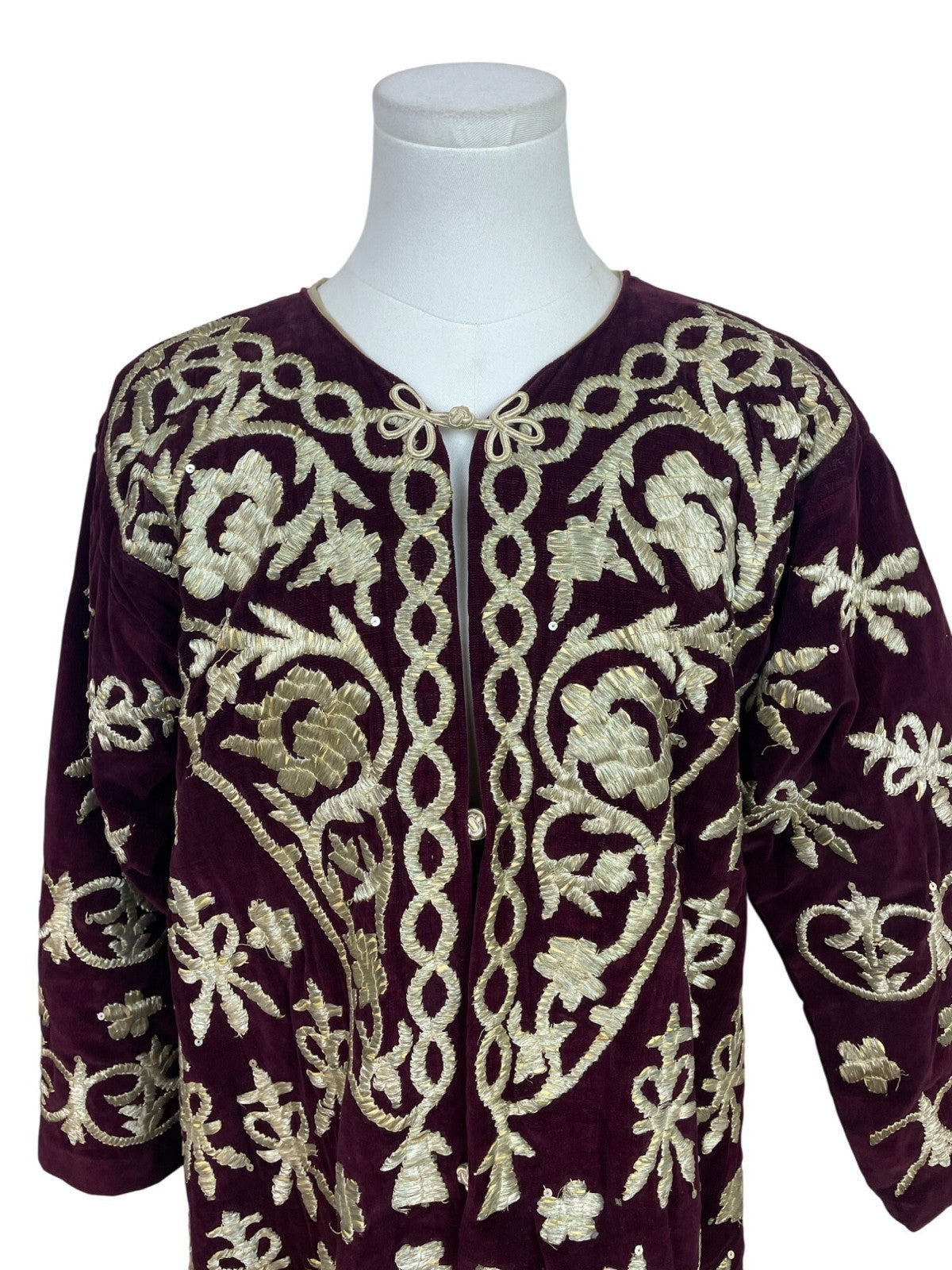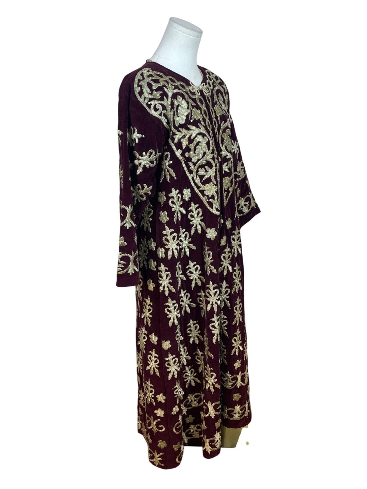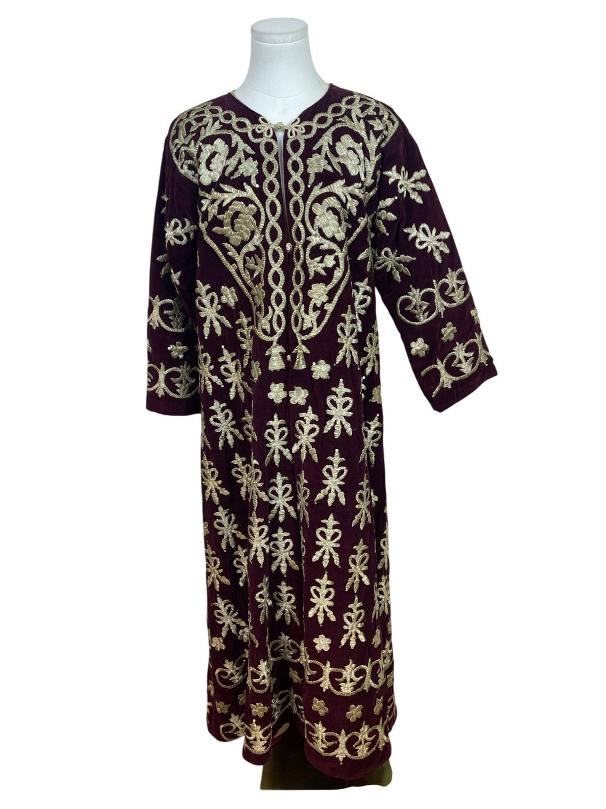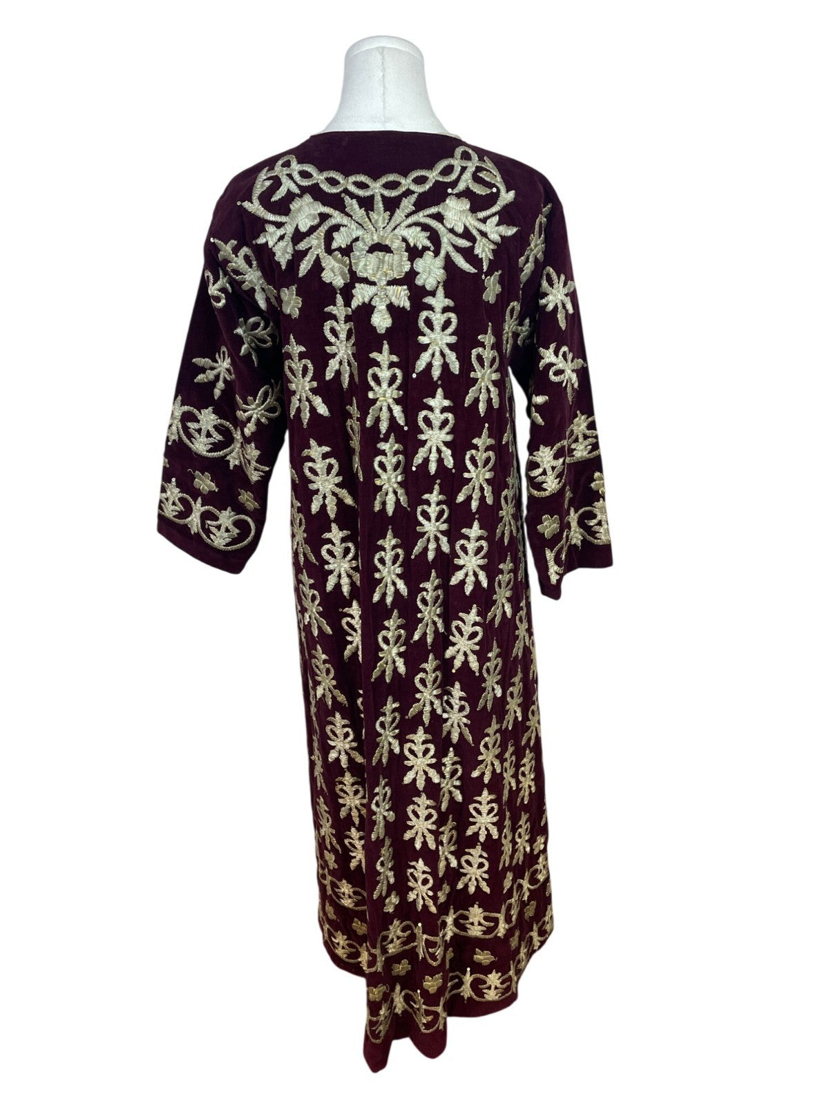 Vintage Women’s Velvet Burgundy & Gold Tone Embroidered Kaftan Dress