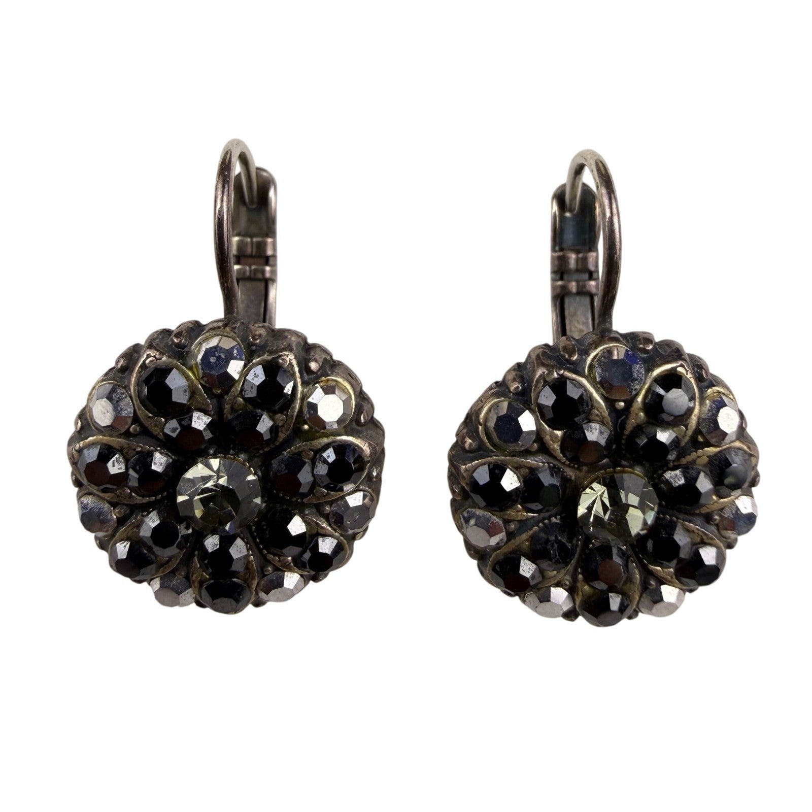Vintage Womens Black Glass & Silver Tone Floral Earrings Drop