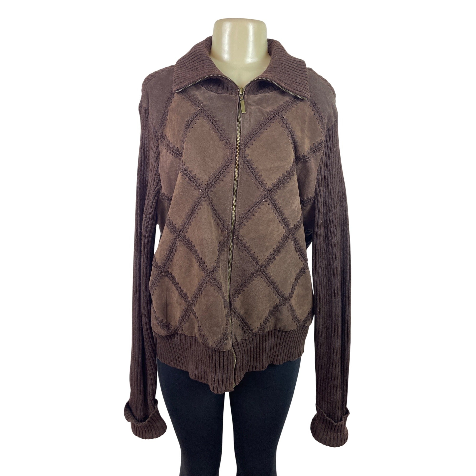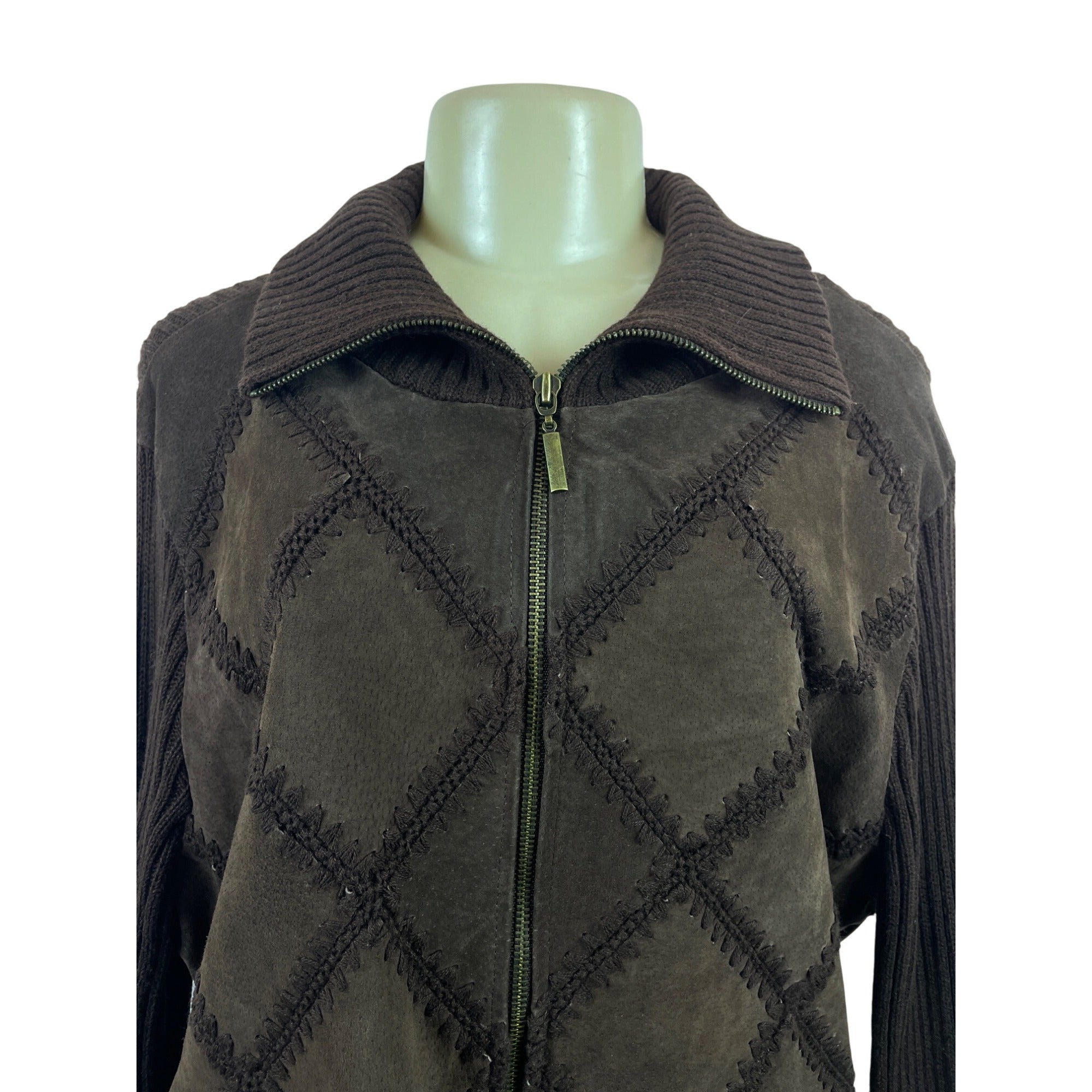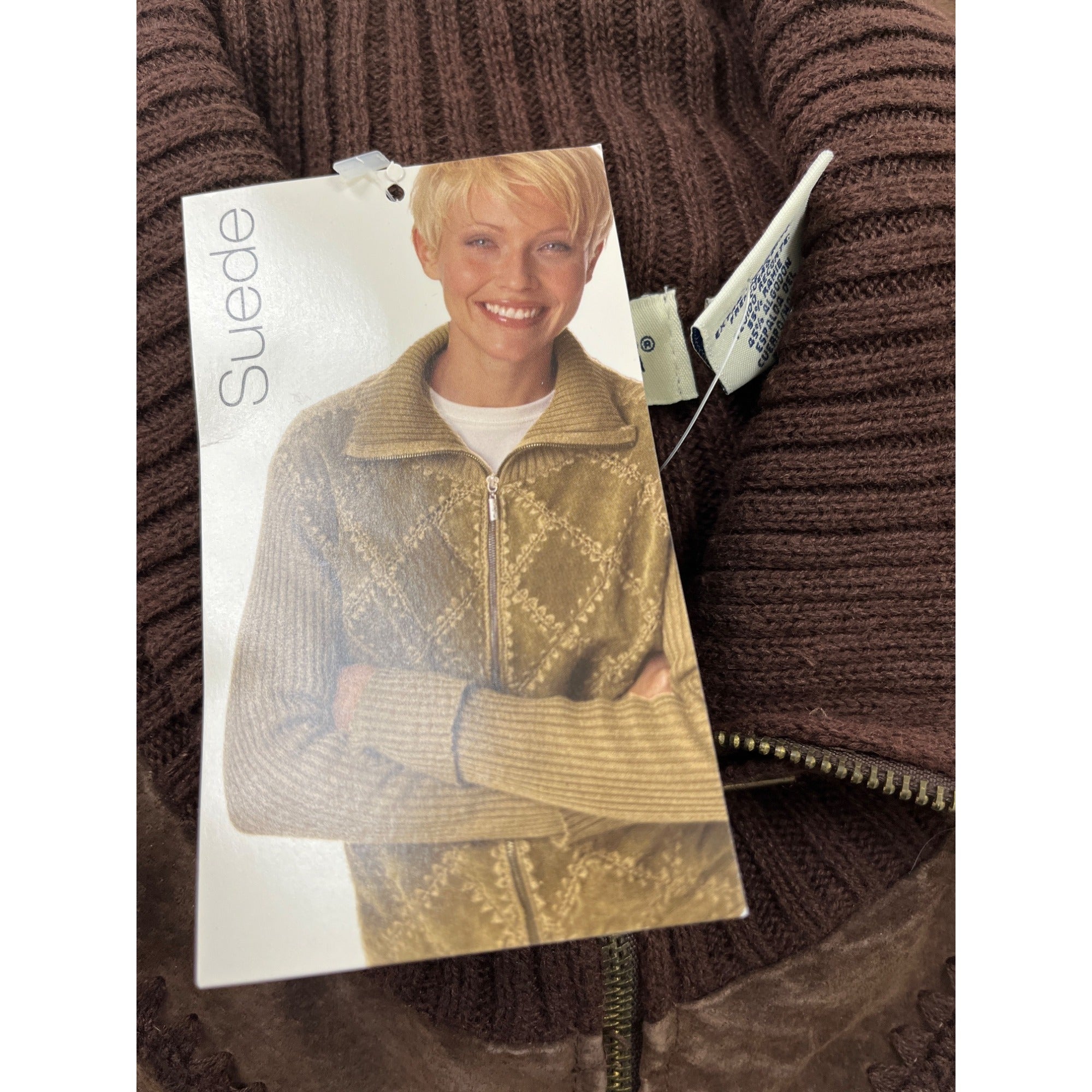 White Stag Women Brown Crochet Suede Jacket Long Sleeve Ribbed Knit Size XL