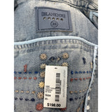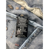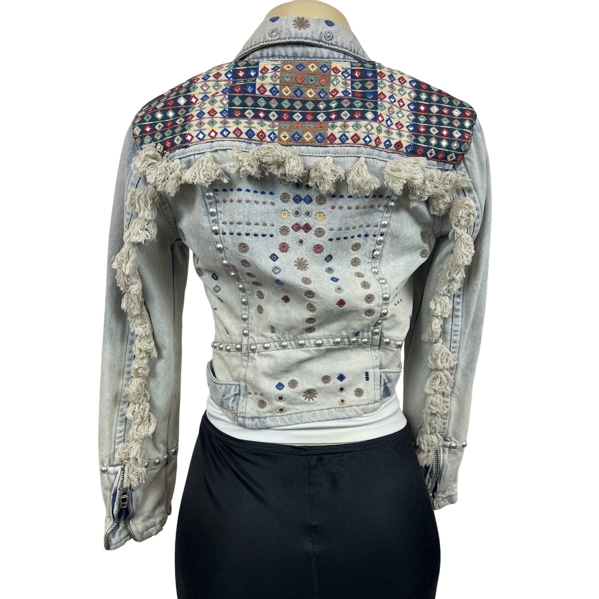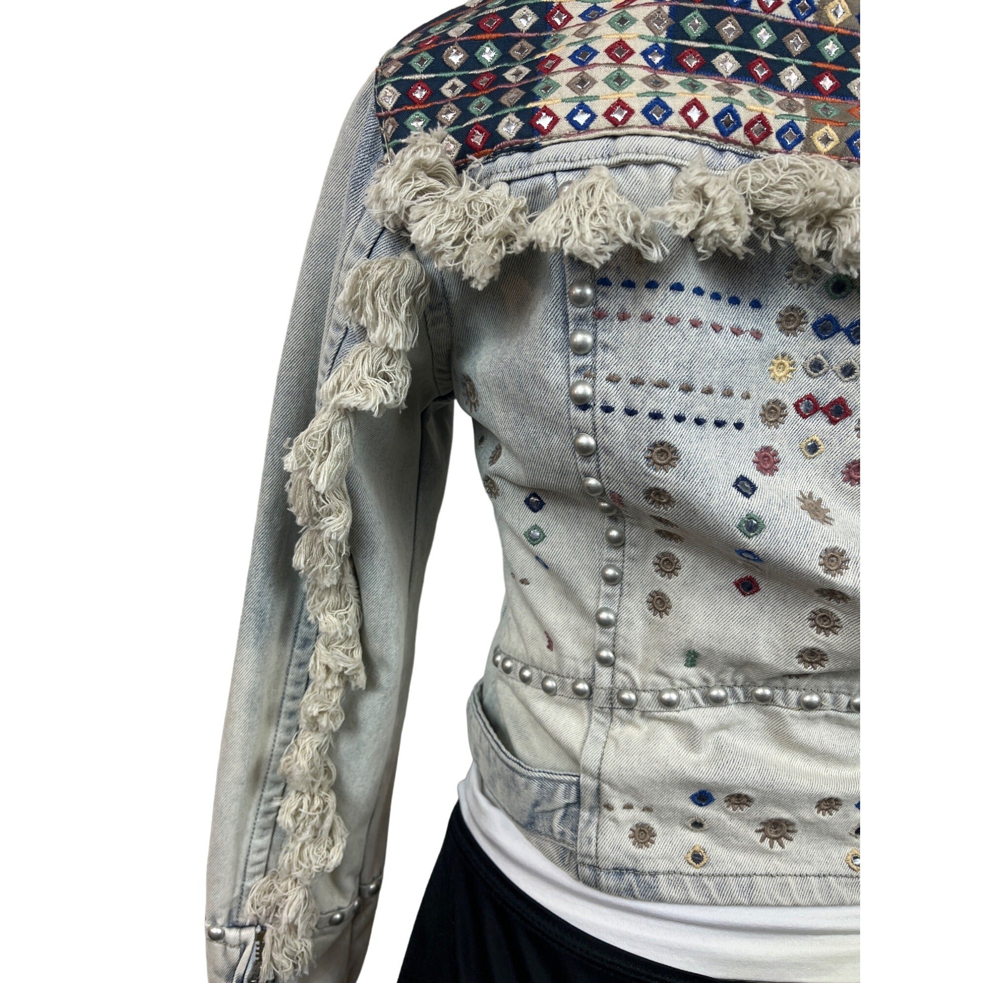 Womens Distressed Denim Jacket With Embellishments & Fringe Details New