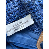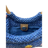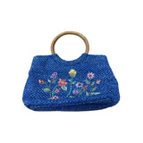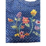 Woven Blue Straw Tote Bag Womens Floral Embroidery With Bamboo Handles